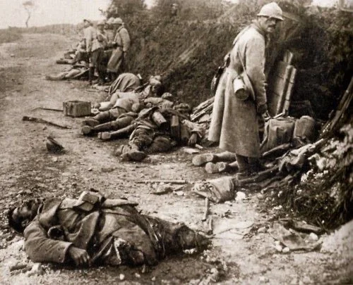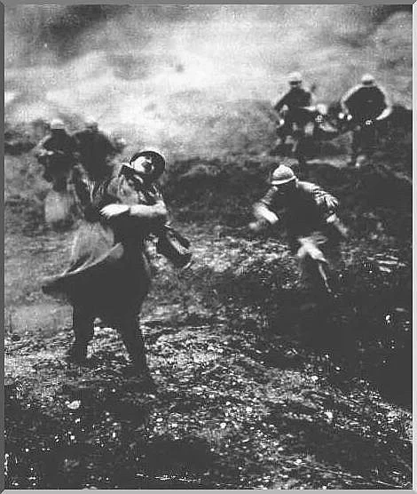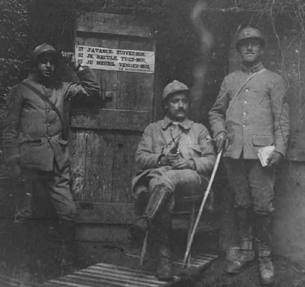 图2:1916年,凡尔登战场的法军战壕。身后的标语写着“若我后退请斩我,若我前进请跟随我,若我战死请为我复仇”