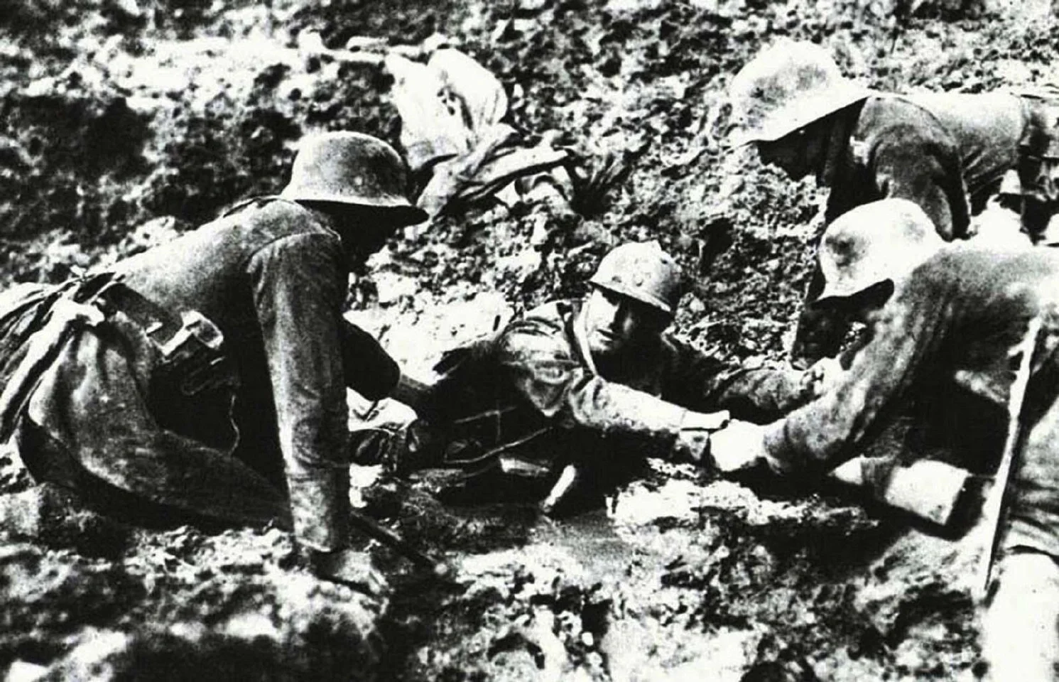 图8:凡尔登战役,德国突击兵正在尝试把一个困在泥洞里的法国士兵拯救出来