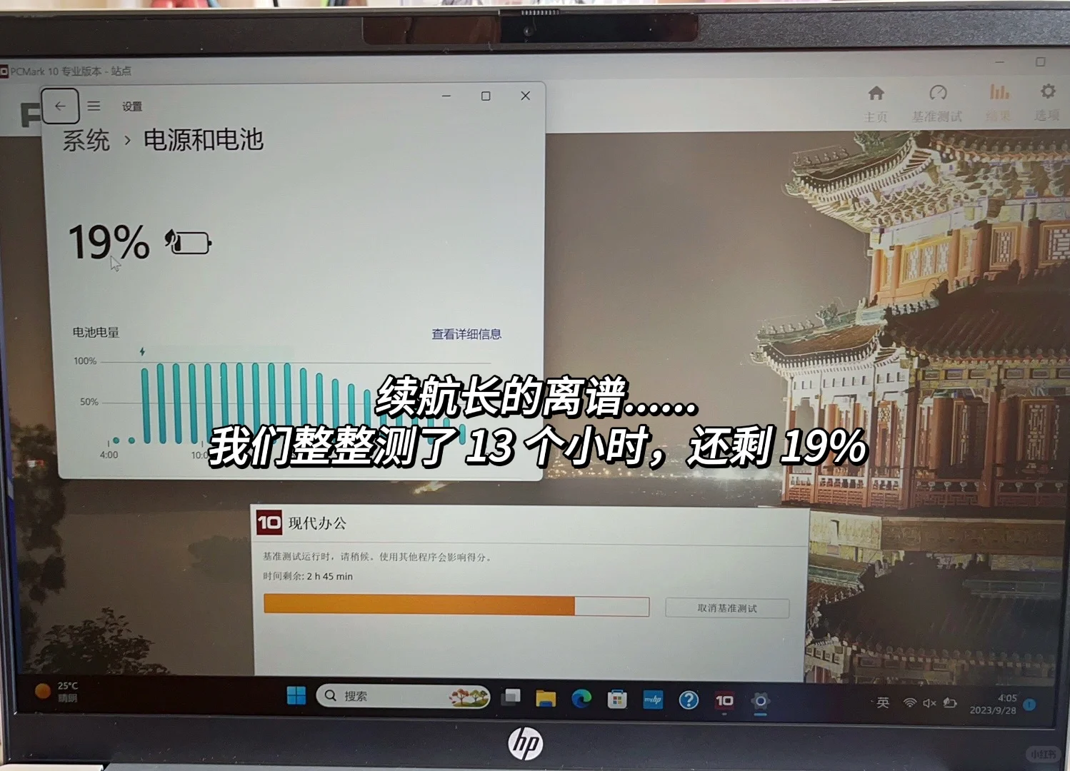 PC Mark10续航测试:大约15个小时(续航太长了,我们测了一晚上还有电,没测完就拍照去了)🔋