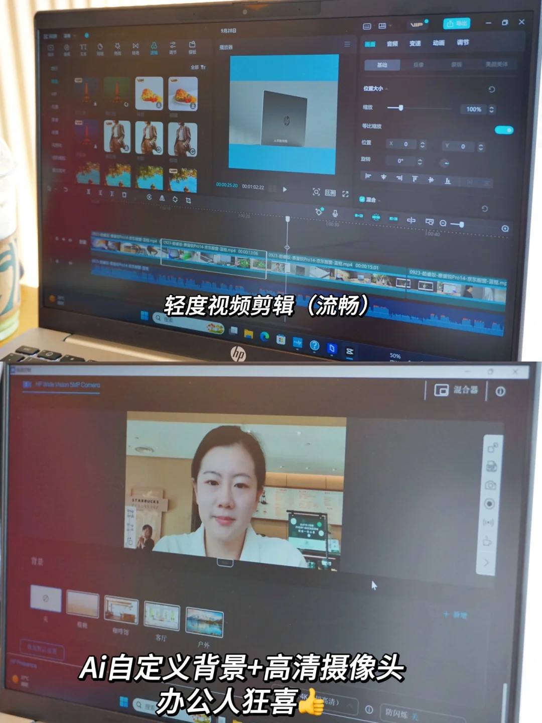 🌟500W高清摄像头,惠普AI技术支持超多实用功能,支持智能抠图可以任意换视频的背景,支持智能跟踪人脸,😃让你时刻处于画面中心位置,开会更方便;还支持外接摄像头,两个摄像头智能切换画面,想要尝试直播的朋友就不需要再额外采买昂贵专业直播设备了,用锐Pro14一人也能体验直播💗💗