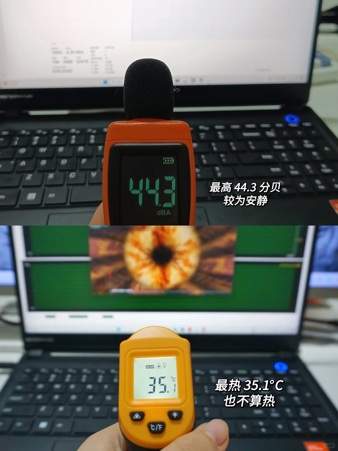 🔺温控/噪音:单烤最高35.1度,可以说摸着都不热,噪音最高44.3分贝,也是相当安静了,玄派这个噪音和温度控制的这么好,1.是7840H处理器是 4nm的制程工艺发热量非常低,2.这款墨影是采用了双风扇设计,散热效率非常高💓