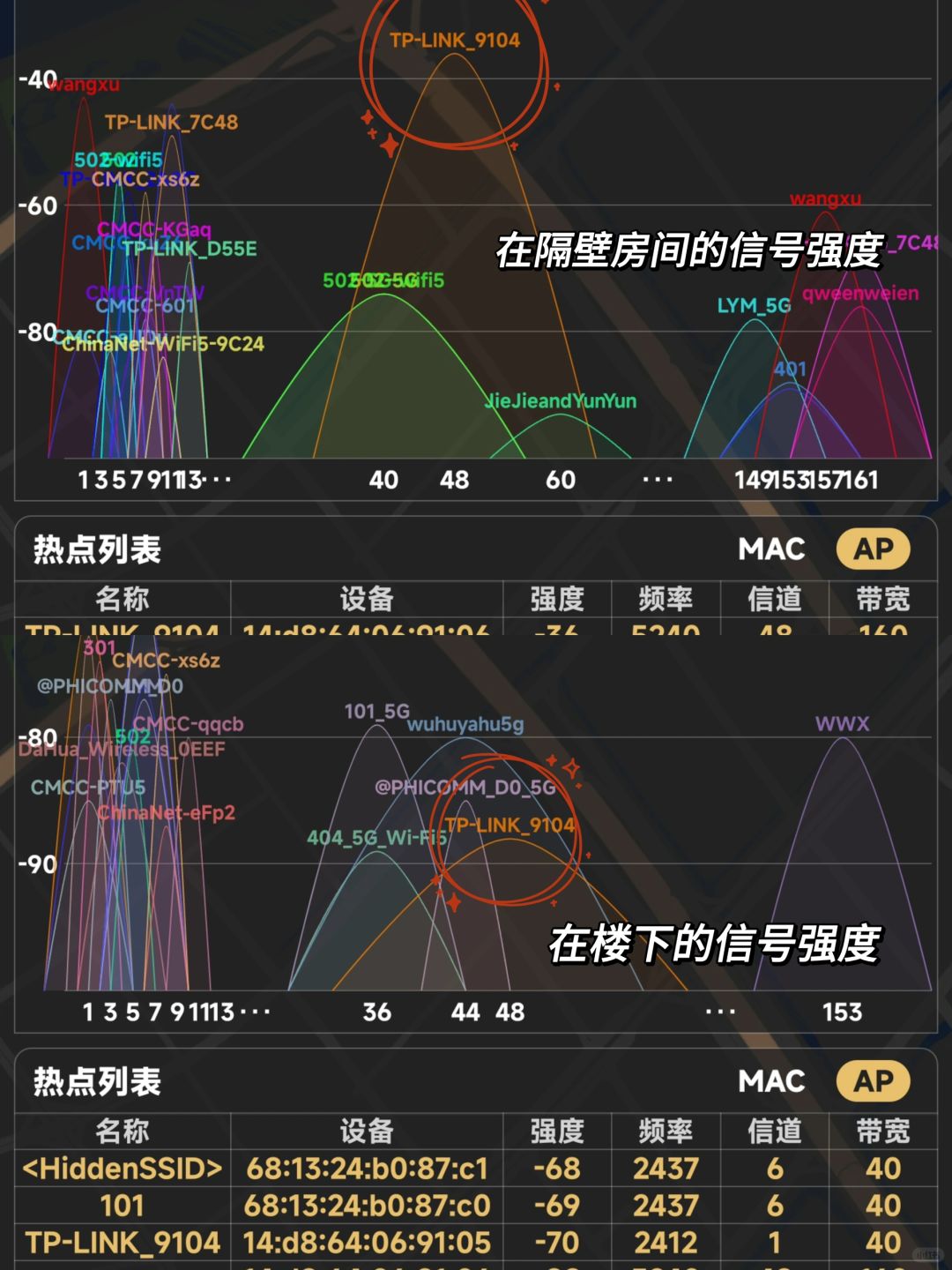 🔺这款路由器在房间内的信号无论哪个角落都是满格的,实测我们去了楼下,可以看到信号强度依然也不错,大概覆盖面积预估100平左右是完全OK的,如果要是超过150平,那我建议组网比较好