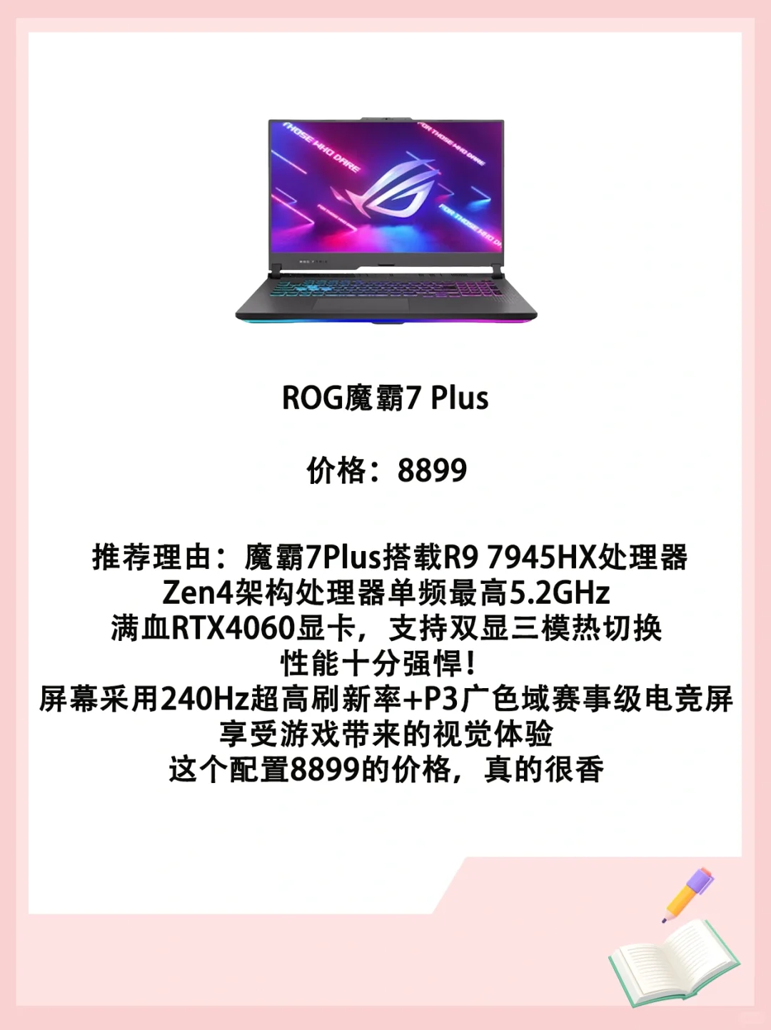 🌟推荐理由:魔霸7Plus搭载R9 7945HX[4] 处理器,Zen4架构处理器单频最高5.2GHz,满血RTX4060显卡,支持双显三模热切换,性能十分强悍!屏幕采用240Hz超高刷新率+P3广色域赛事级电竞屏,享受游戏带来的视觉体验。这个配置8899的价格,真的很香💓💓