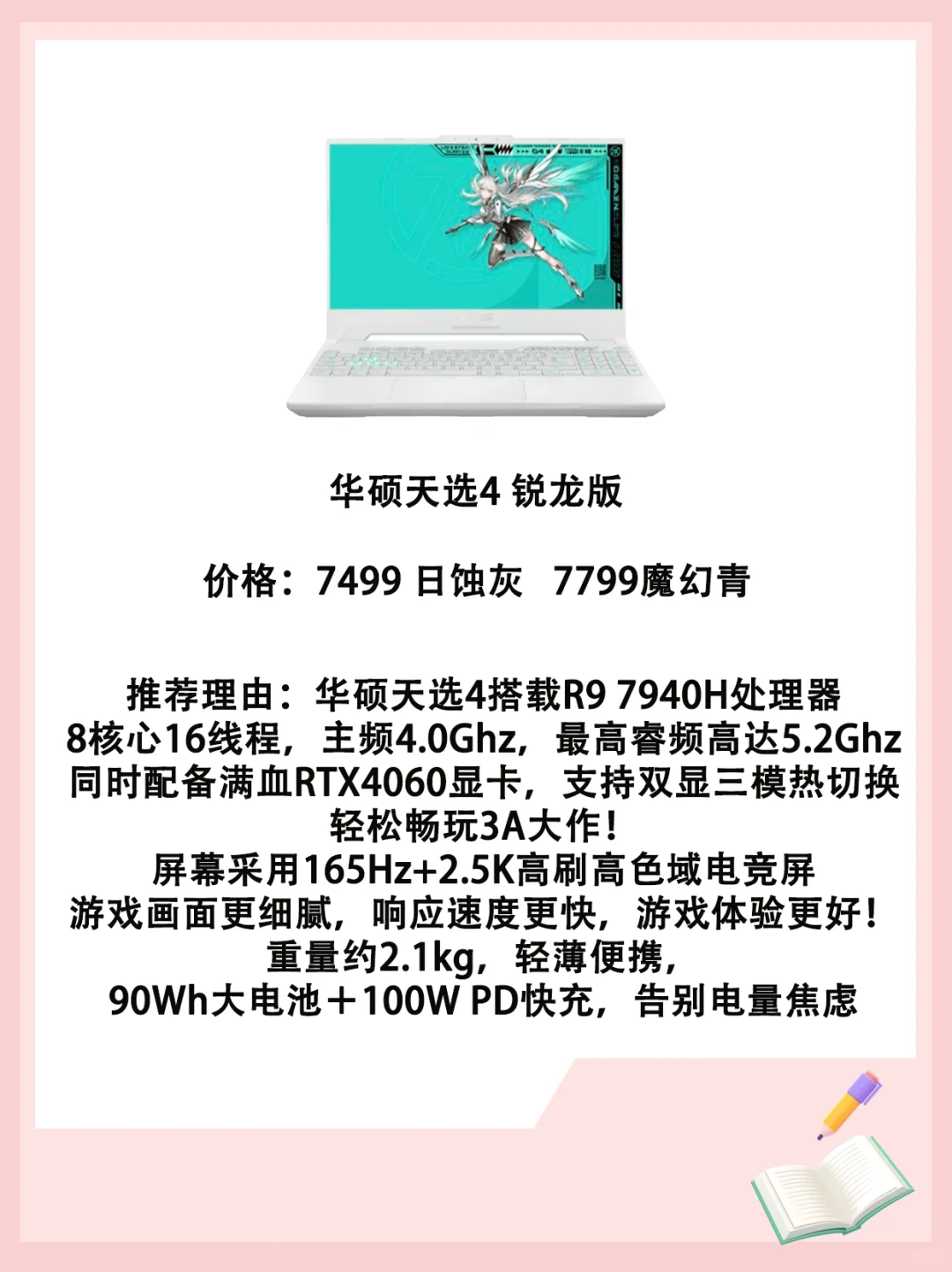 🌟推荐理由:华硕天选4搭载R9 7940H处理器,8核心16线程,主频4.0Ghz,最高睿频高达5.2Ghz,同时配备满血RTX4060显卡,支持双显三模热切换,轻松畅玩3A大作!😍屏幕采用165Hz+2.5K高刷高色域电竞屏,游戏画面更细腻,响应速度更快,游戏体验更好!重量约2.1kg,轻薄便携,90Wh大电池+100W PD快充,告别电量焦虑🔋