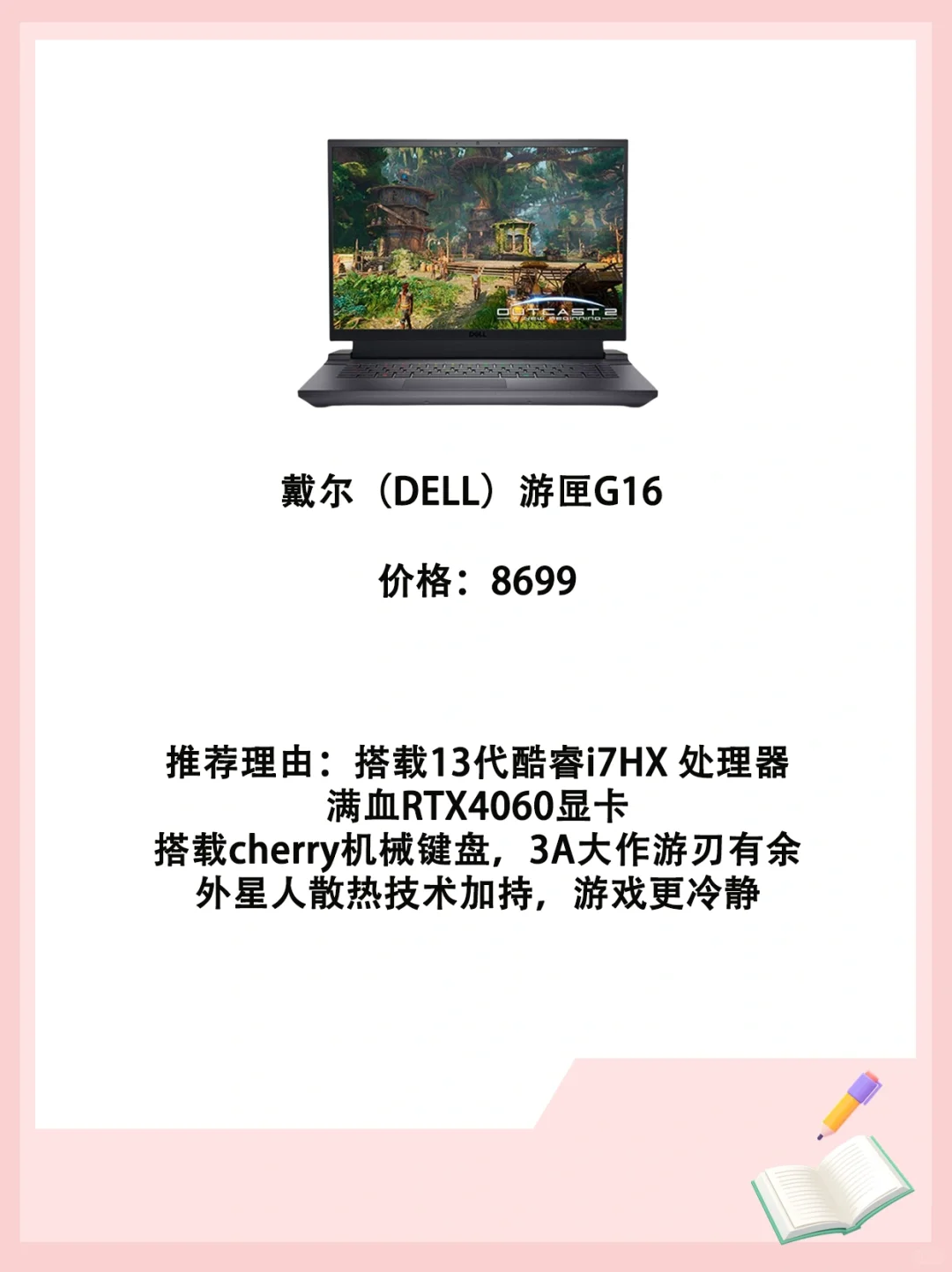 🌟推荐理由:搭载13代酷睿i7HX 处理器,满血RTX4060显卡,搭载cherry机械键盘,3A大作游刃有余,外星人散热技术加持,游戏更冷静💗