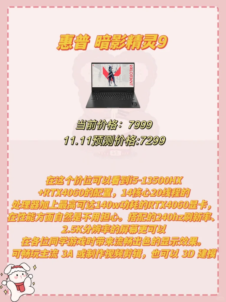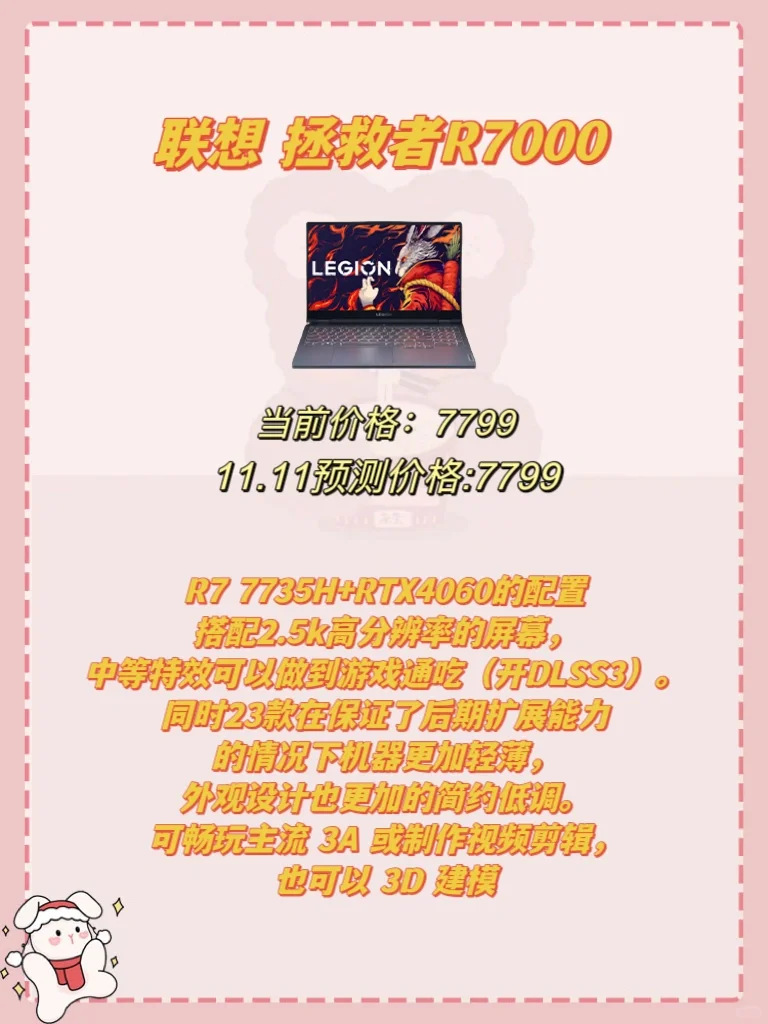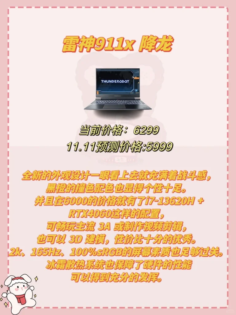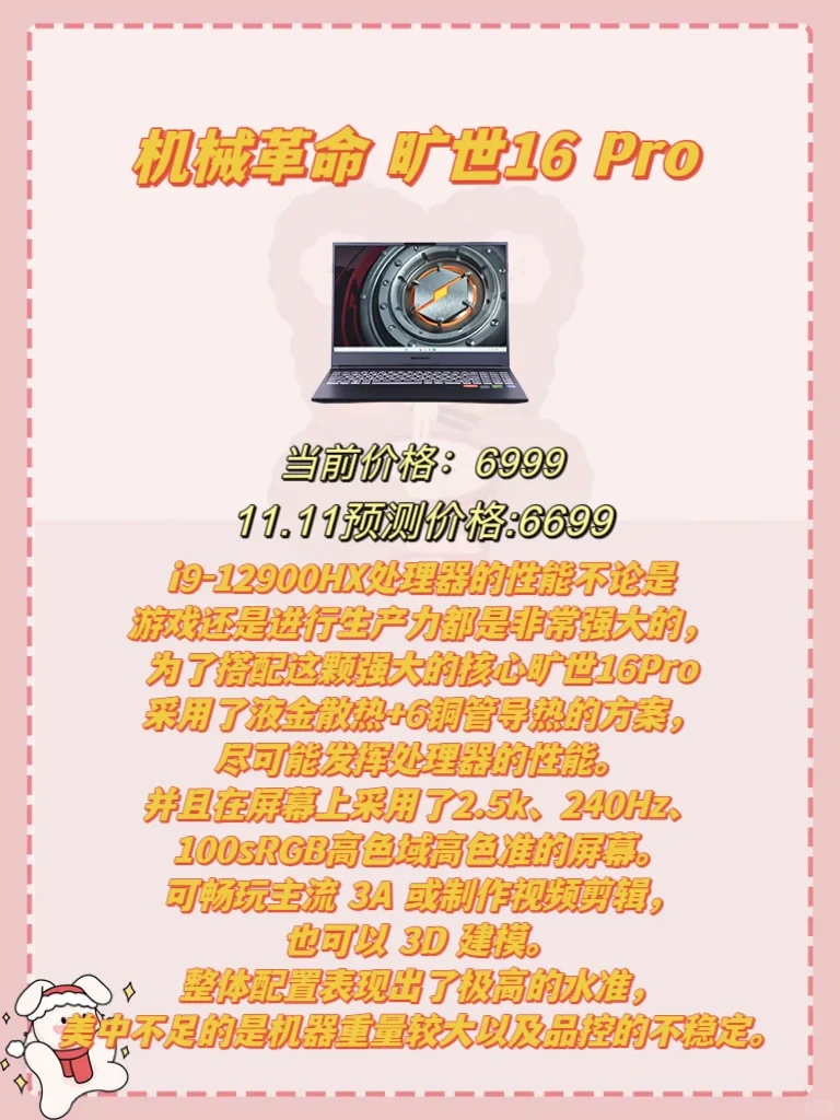 i9-12900HX+RTX4060的配置搭配上1T的固态硬盘价格不到7k,让人不禁感叹一声价格屠夫,不论是游戏还是进行生产力都是非常强大的,特点是散热好缺点是机器重以及品控的不稳定,建议对性能有较高要求并且有一定折腾能力的同学考虑。