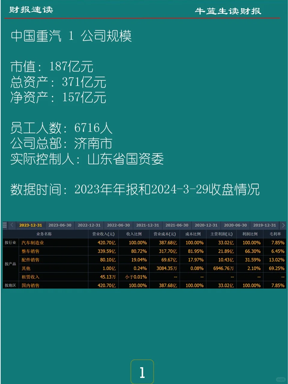 中国重汽集团济南卡车股份有限公司主要从事重型载重汽车、重型专用车底盘、车桥等汽车配件的制造及销售业务。主要产品有整车销售、配件销售。公司目前产品除在国内市场占据较高市场份额外,依托中国重汽集团国际有限公司,产品出口已经多年位居国内重卡行业出口首位,连续多年保持国内重卡出口行业首位。