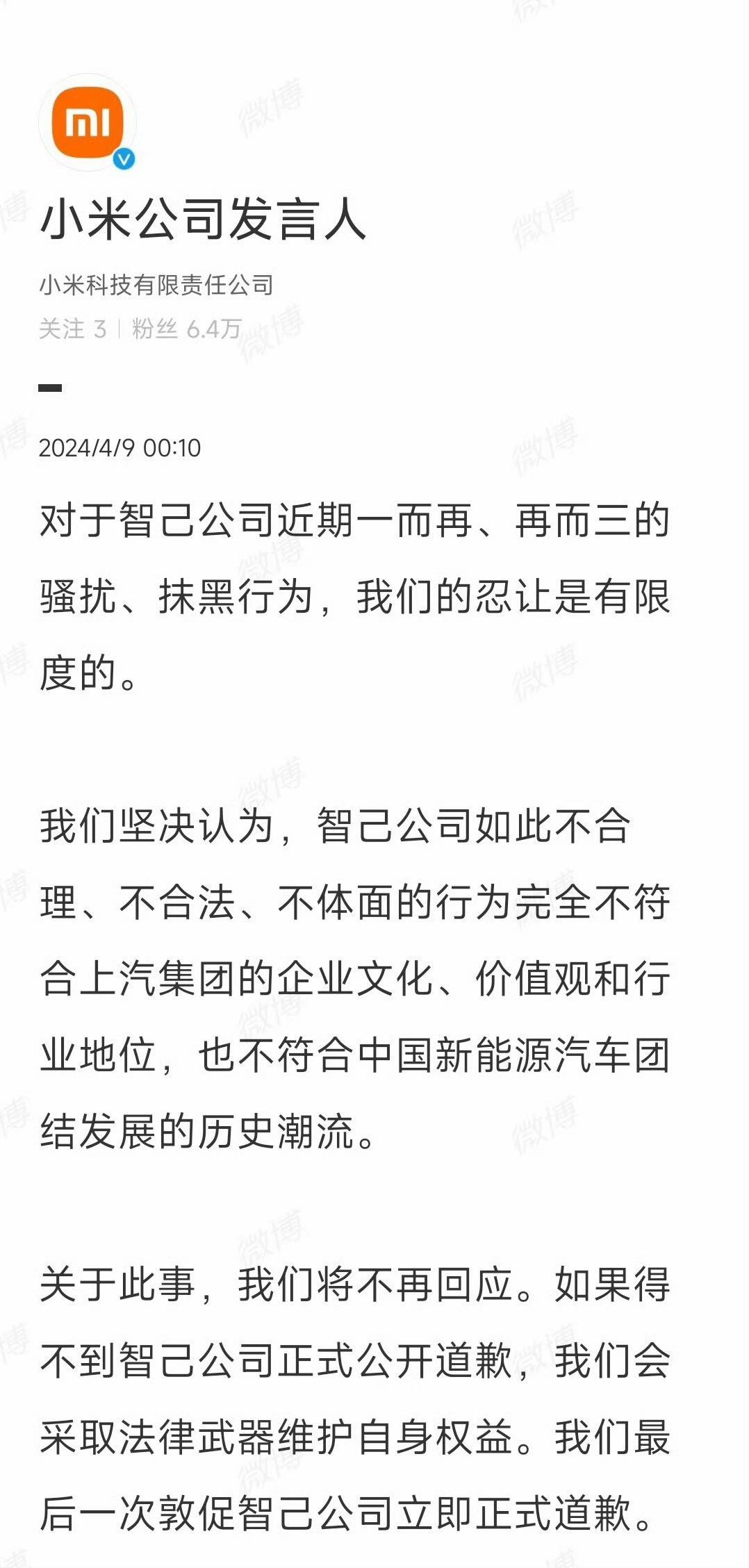 #小米公司深夜连发三文# 小米VS上汽 起因是智己L6预售发布会,智己官方对小米