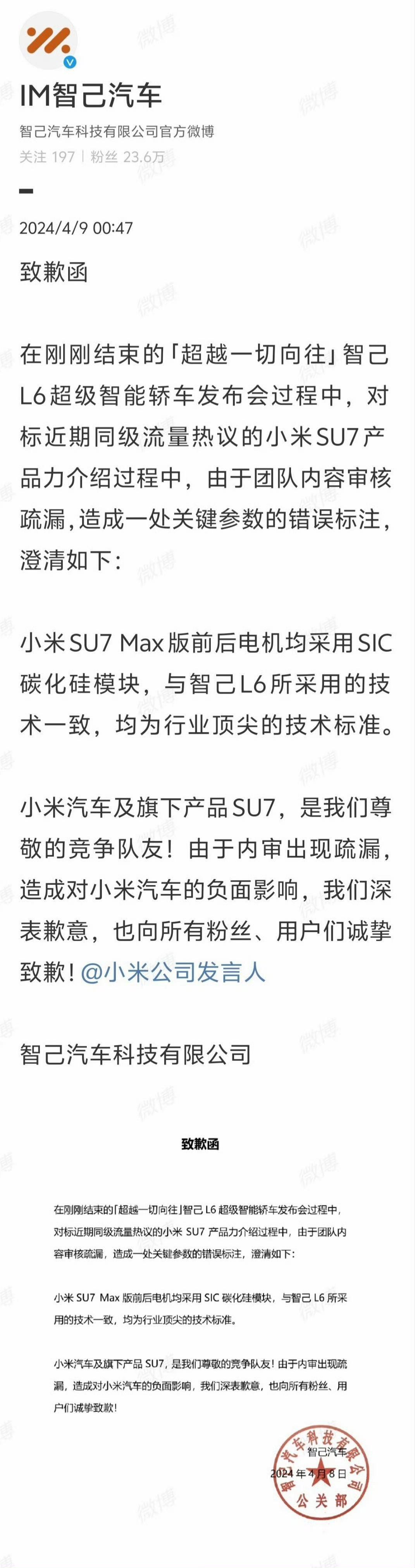#小米公司深夜连发三文# 小米VS上汽 起因是智己L6预售发布会,智己官方对小米SU7产品介绍时,出现错误标注。#智己汽车正式向小米道歉# 剧本是这样的: 智己:致歉小米,致敬对手,流量到手,声量达成 小米:我看以后谁还敢蹭我流量 极氪:打架可别动手,你们继续。我007和001的销量目前不错,感谢小米,盘活了纯电轿车市场。另外,我009也马上要出激光雷达版,欢迎大家关注。 保时捷/BBA/特斯拉:我都被人直接点名多少次了,我说啥了,还是你们中国车刺激,姆们老家“朋友”之间不这么聊天。 消费者:打吧,卷吧,谁出价低我支持谁。 友商们:不是说好了,中国车,在一起。【来自懂车帝车友圈】