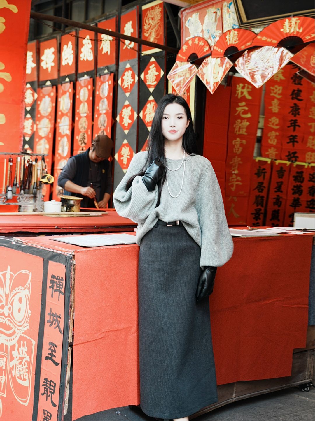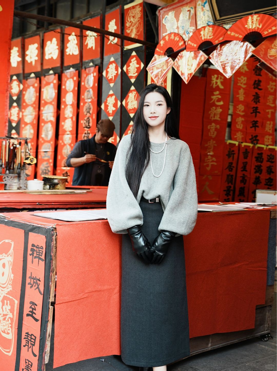 优雅东方韵,浅蓝上衣配米色长裤,漫步古风庭院,尽显时尚与古典的完美融合。