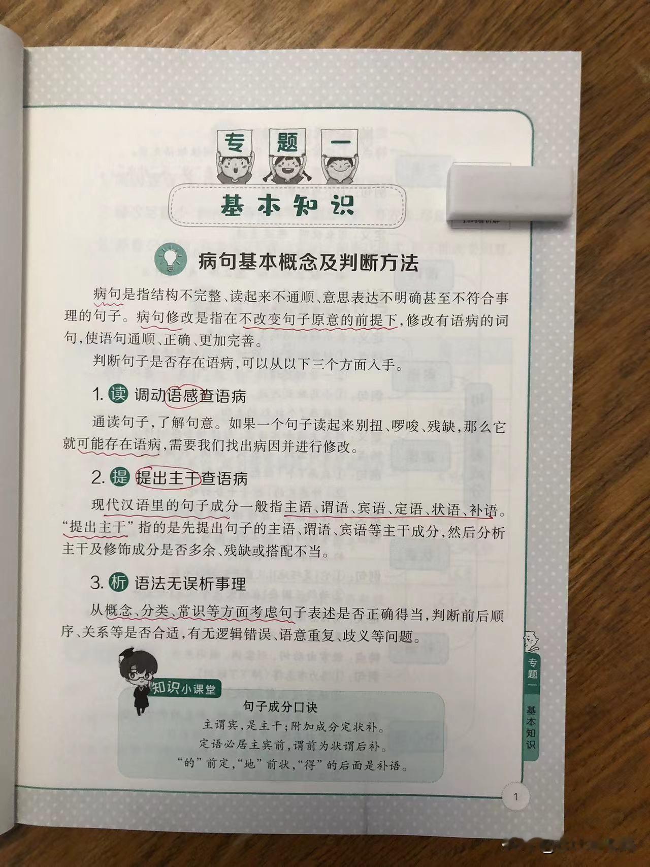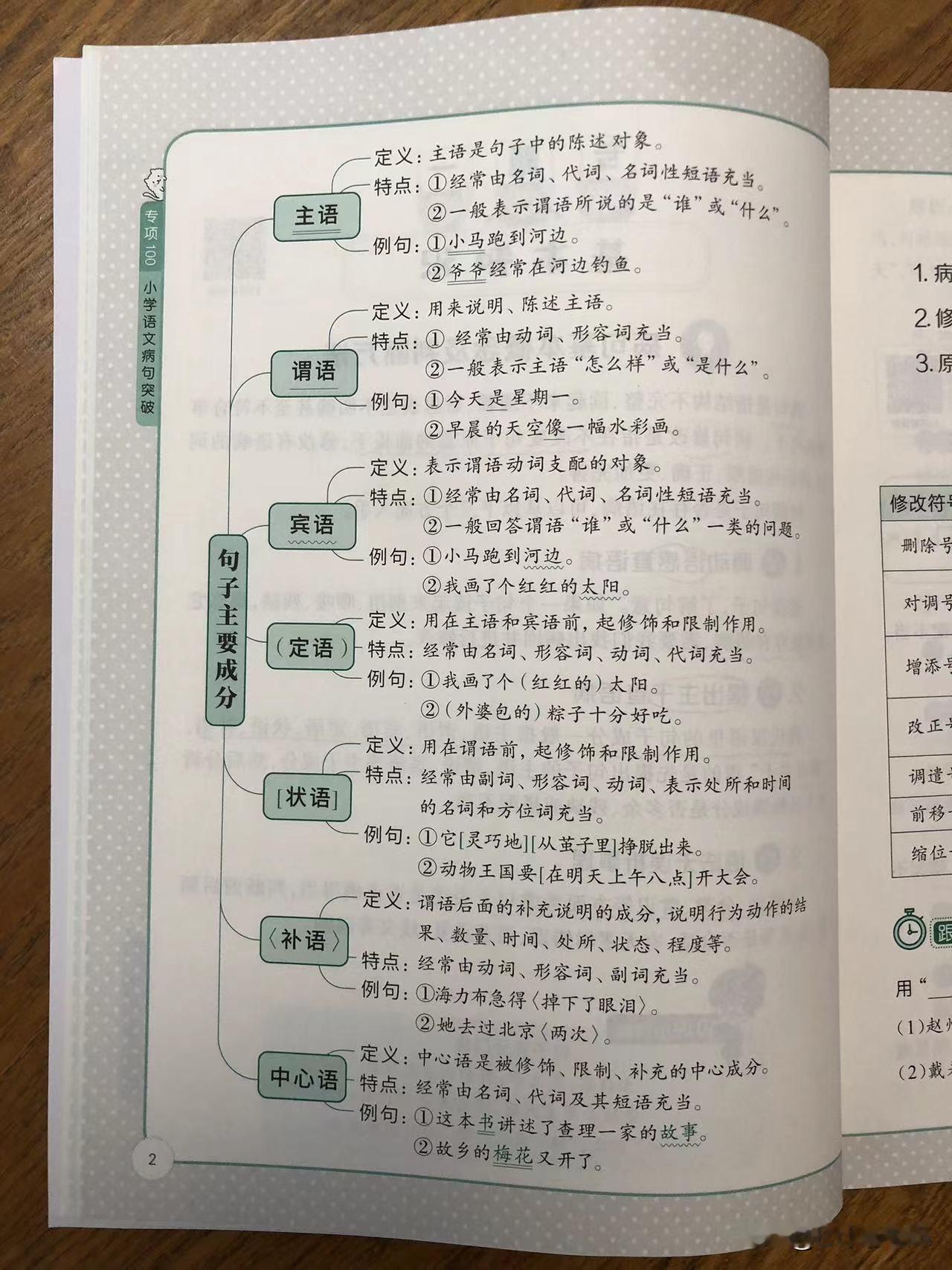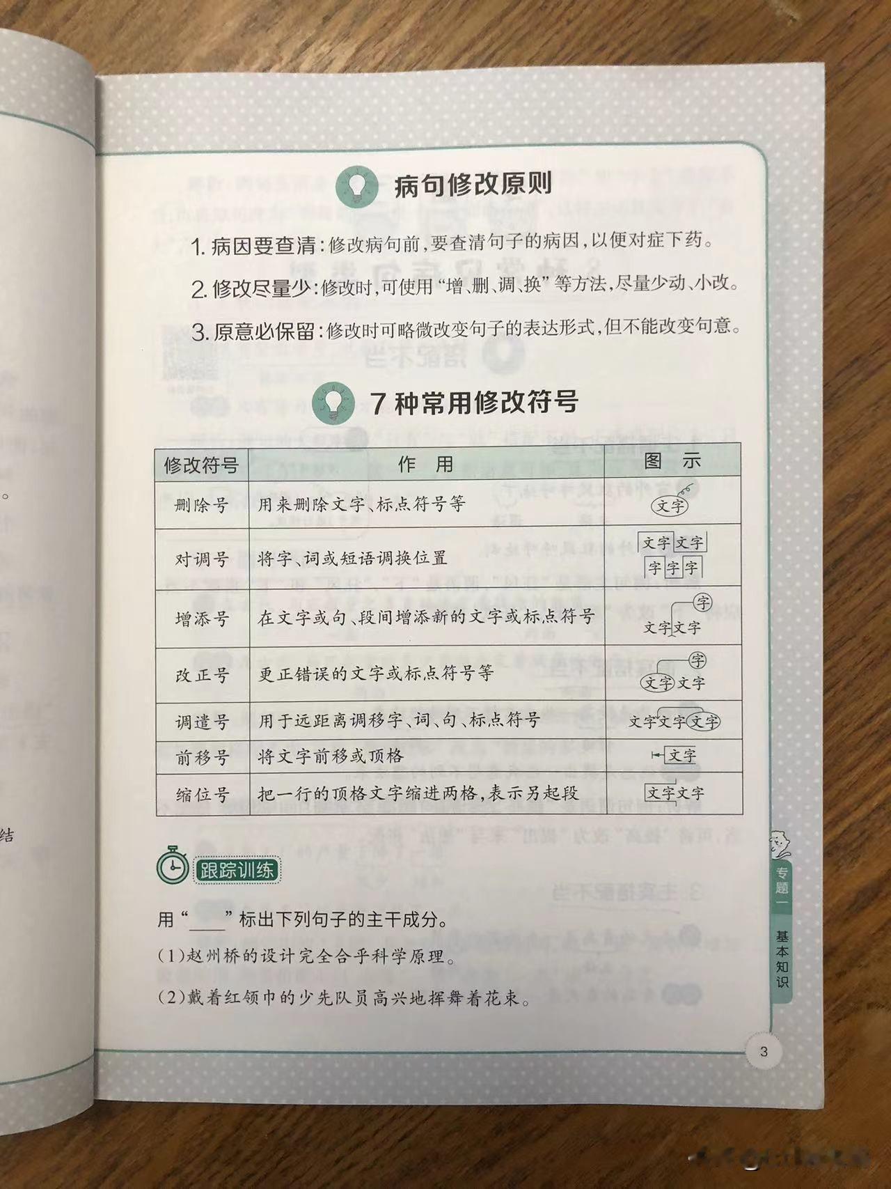 【小升初语文,语法系列的3个专项中,最难的应该就是病句】 六年级娃一面重点搞数学,一面复习语文的语基。而在语法之下,病句、修辞、标点,我之前就觉得,应该是病句难度最大。 如今一细翻”病句专项“,更是坚定了这个想法,因为它涉及语法、涉及成分,涉及逻辑,系统性的知识点很多。 要想”知其然,还知其所以然“的做出病句题,非得系统的提前学一下句子成分这一部分语法不可,不然,娃都是在靠着中文”语感“来做题,靠着老师的就题讲题去零碎积累一些语法知识。 1】要孩子分析句子成分,前提是知道句子成分都有哪些? 做病句题,很多娃是靠语感的。 靠语感做题也没啥,首先读一遍,通不通顺,先模糊直观的判断哪有问题。 但这是远远不够的,想要确定拿到分数,得明明白白的知道错在哪,属于什么类型,如何改。 这和我们做英语语法题,其实是同样的思路,得主打一个明白。 但是,我们小学英语学语法,语文却不学的,得要到初中去。 更何况”语感“这个东西,真是因人而导啊,现在有些娃,中文语感也很差啊。 所以,抽时间,好好捋一遍句子主要成分,主谓宾定状补是相当实用的。 既可以解决小学病句的语法理解,又是在为初中语法做准备。 2】常见病句的8种类型,都是哪些? 搭配不当、语序不当、成分残缺、成分赘余、句式杂糅、表意不明、不合逻辑、分类不当。 以上8种是最常见的。 看了一下,也还是跟词语、成分、逻辑关联比较大。 大部分的情况下,小学语文老师都是在讲题、讲卷的时候,会讲到病句的错误类型,但能不能集中统一的去细讲各大常见类型,就要看老师们的时间安排了。 而且这个常见病句类型,既要求孩子有句子成分的前置知识点,存在理解难度;又分量着实很多,工作量挺大的。 所以,病句真应该多花点时间,哪怕是语基比较好的语文尖子生,把这一块的语法逻辑理清楚,给初中打个好底子。 #小升初##语文# 小学语文病句+修辞+标点