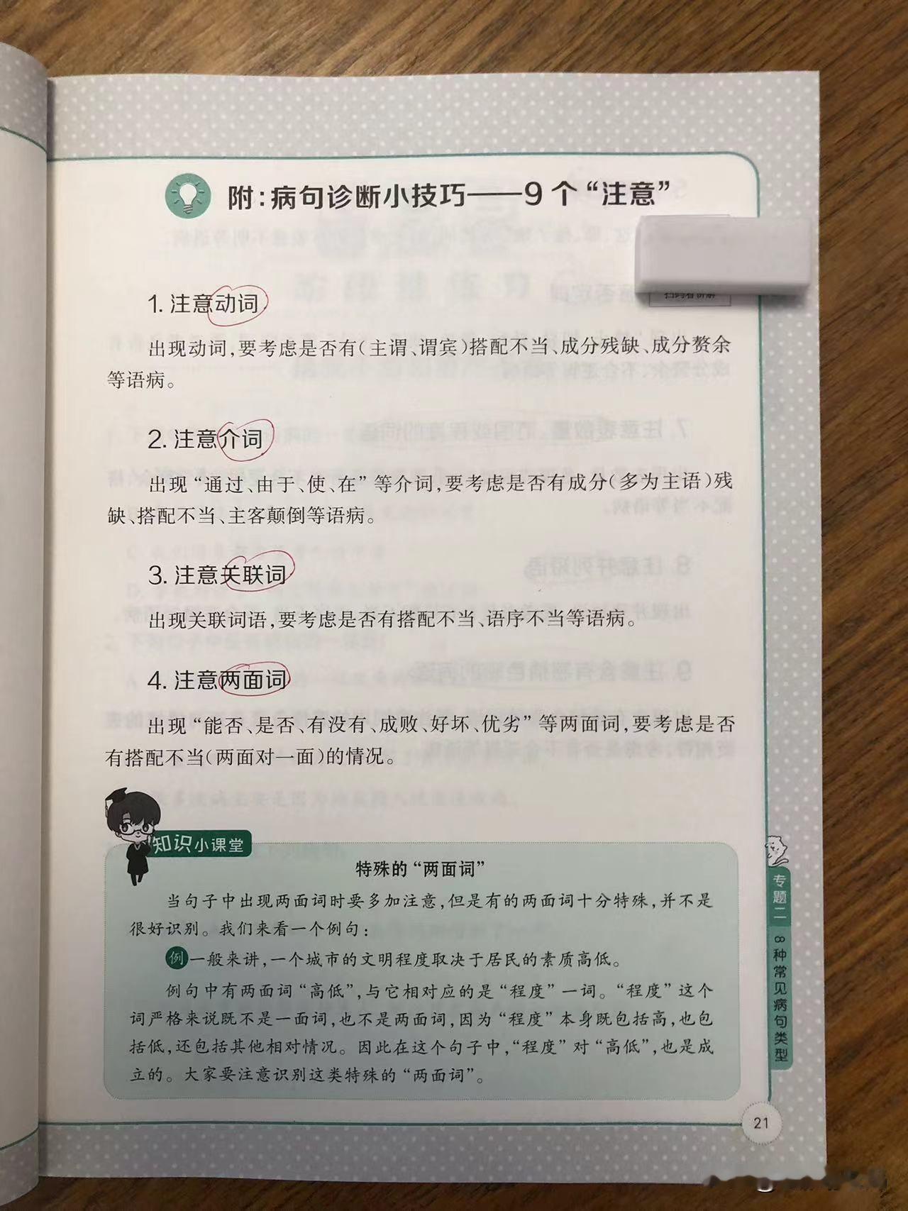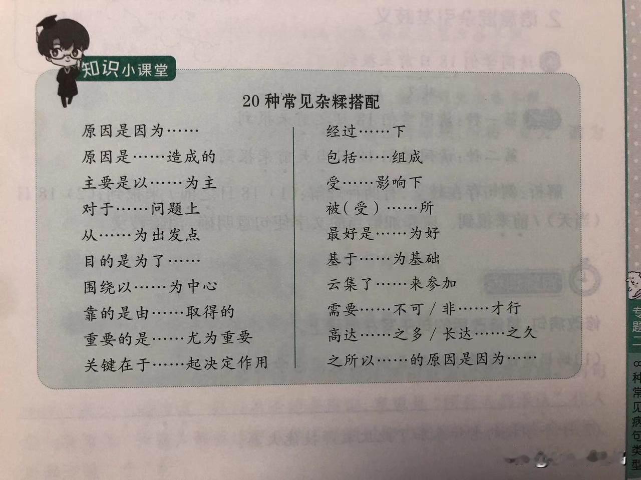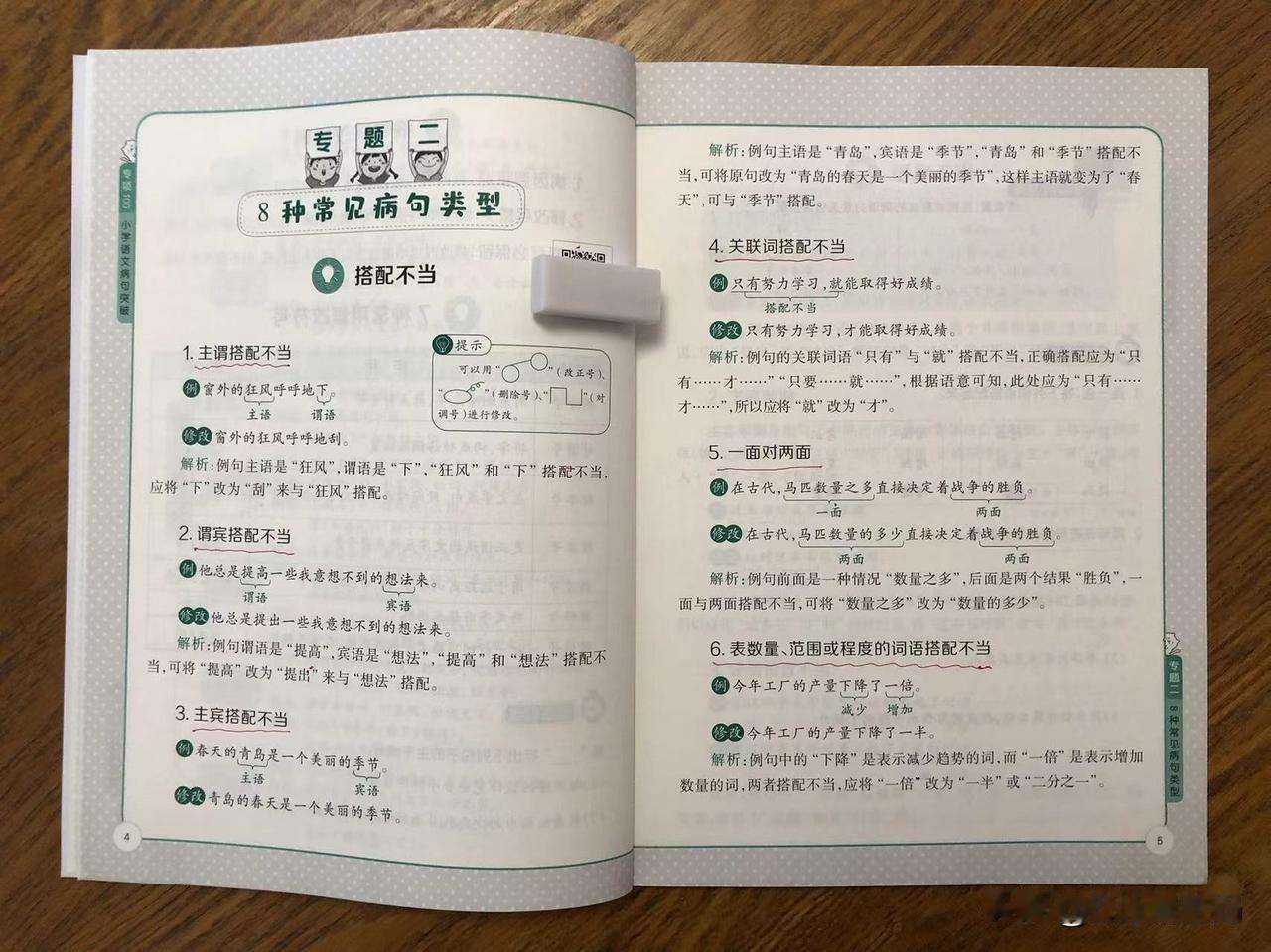 【小升初语文,语法系列的3个专项中,最难的应该就是病句】 六年级娃一面重点搞数学,一面复习语文的语基。而在语法之下,病句、修辞、标点,我之前就觉得,应该是病句难度最大。 如今一细翻”病句专项“,更是坚定了这个想法,因为它涉及语法、涉及成分,涉及逻辑,系统性的知识点很多。 要想”知其然,还知其所以然“的做出病句题,非得系统的提前学一下句子成分这一部分语法不可,不然,娃都是在靠着中文”语感“来做题,靠着老师的就题讲题去零碎积累一些语法知识。 1】要孩子分析句子成分,前提是知道句子成分都有哪些? 做病句题,很多娃是靠语感的。 靠语感做题也没啥,首先读一遍,通不通顺,先模糊直观的判断哪有问题。 但这是远远不够的,想要确定拿到分数,得明明白白的知道错在哪,属于什么类型,如何改。 这和我们做英语语法题,其实是同样的思路,得主打一个明白。 但是,我们小学英语学语法,语文却不学的,得要到初中去。 更何况”语感“这个东西,真是因人而导啊,现在有些娃,中文语感也很差啊。 所以,抽时间,好好捋一遍句子主要成分,主谓宾定状补是相当实用的。 既可以解决小学病句的语法理解,又是在为初中语法做准备。 2】常见病句的8种类型,都是哪些? 搭配不当、语序不当、成分残缺、成分赘余、句式杂糅、表意不明、不合逻辑、分类不当。 以上8种是最常见的。 看了一下,也还是跟词语、成分、逻辑关联比较大。 大部分的情况下,小学语文老师都是在讲题、讲卷的时候,会讲到病句的错误类型,但能不能集中统一的去细讲各大常见类型,就要看老师们的时间安排了。 而且这个常见病句类型,既要求孩子有句子成分的前置知识点,存在理解难度;又分量着实很多,工作量挺大的。 所以,病句真应该多花点时间,哪怕是语基比较好的语文尖子生,把这一块的语法逻辑理清楚,给初中打个好底子。 #小升初##语文# 小学语文病句+修辞+标点