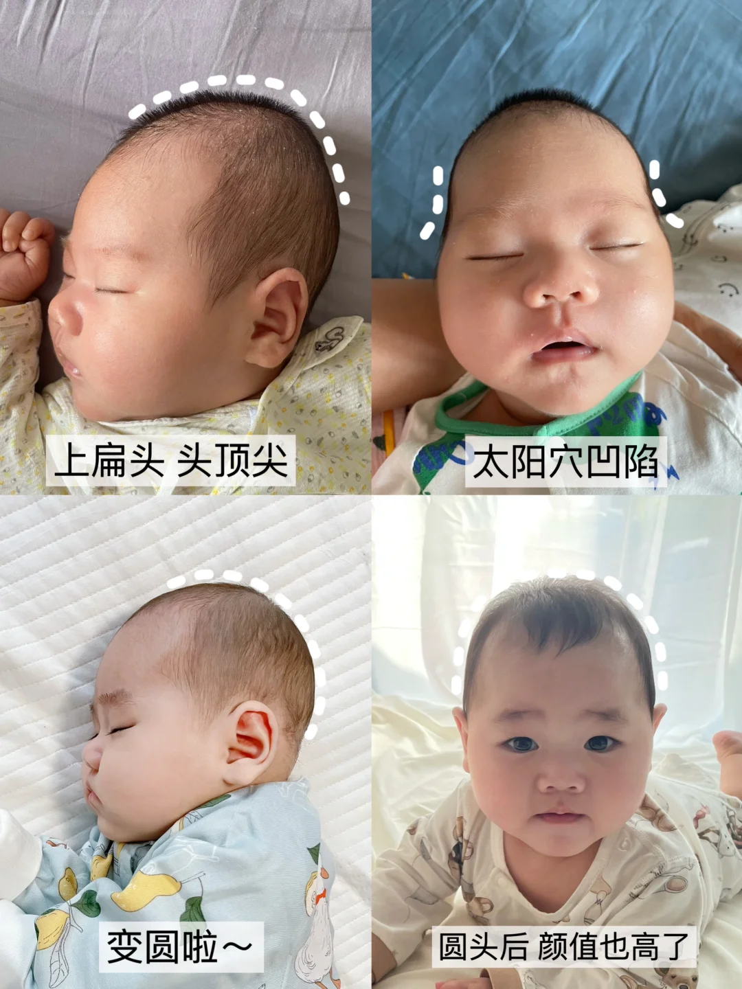 🥉3~6个月:观察宝宝头型,哪里凸出就睡哪里,用定型枕辅助