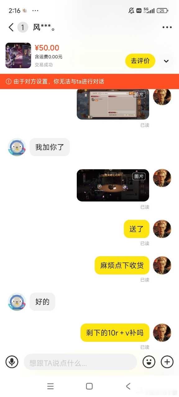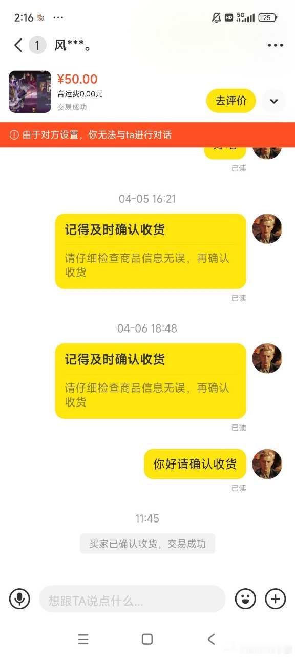 结果迟迟不收货拖了8天,到4.11中午才收货,然后把我拉黑了后面消息都发不出去。