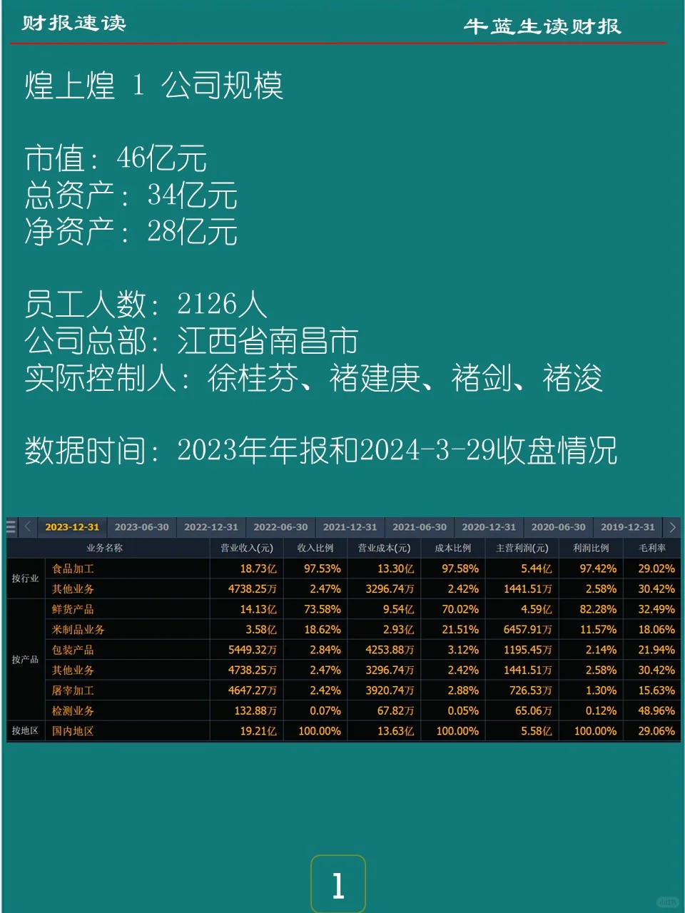 江西煌上煌集团食品股份有限公司专注于酱卤肉制品、米制品及少量佐餐凉菜等其他产品的开发、生产和销售。主要产品为鲜货产品、包装产品、禽肉产品、畜肉产品、屠宰加工、米制品业务、检测业务等。公司的快捷消费产品主要分为两类:第一类主要是以鸭、鸡、鹅、猪、牛、羊等禽畜产品为原材料,经过酱、卤生产工艺形成的快捷消费酱卤肉制品;第二类主要是以蔬菜、水产品、豆制品等为原材料,经过凉拌、酱腌等生产工艺形成的佐餐凉菜快捷消费食品。目前公司的主导产品为快捷消费酱卤肉制品。