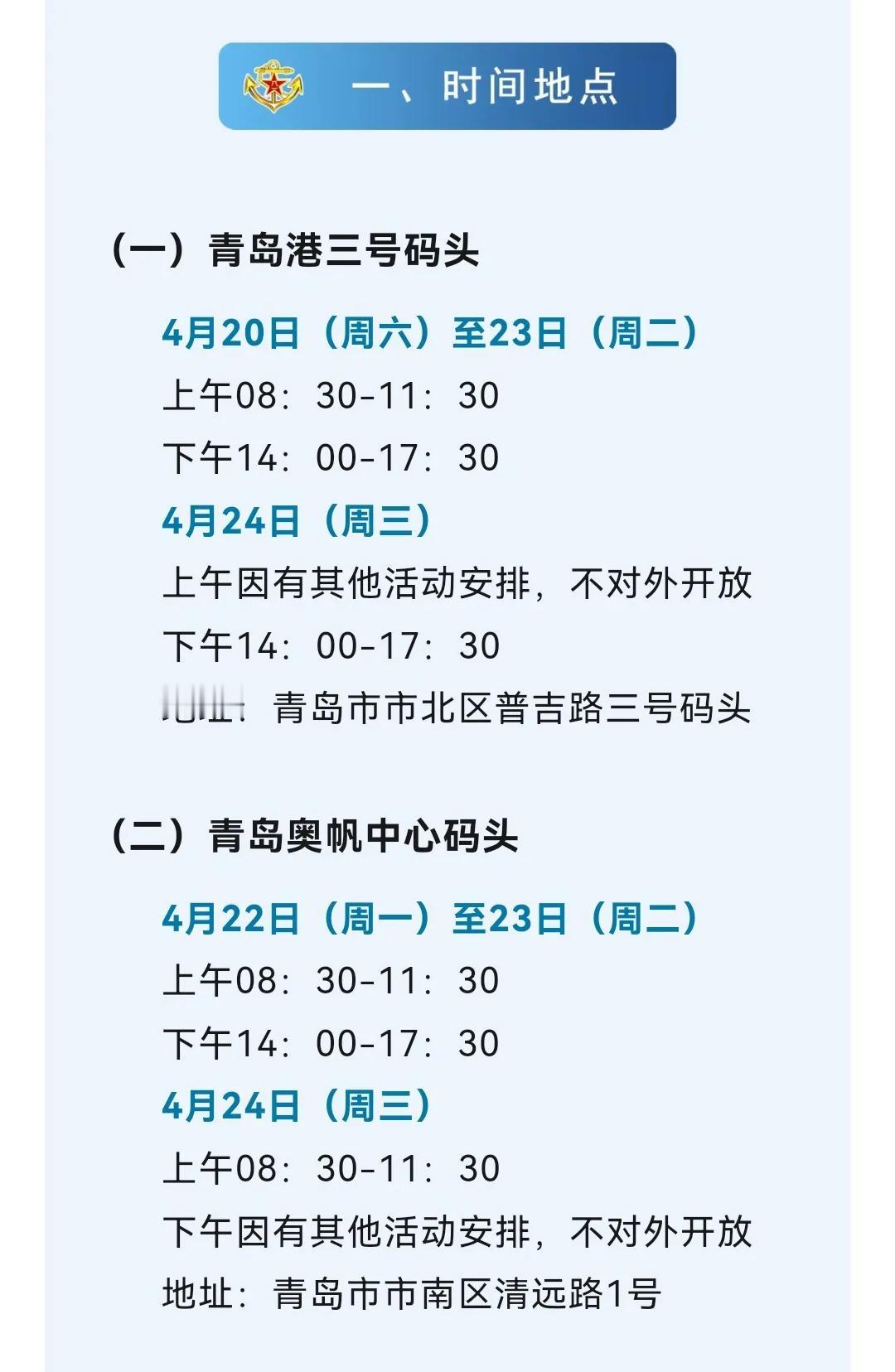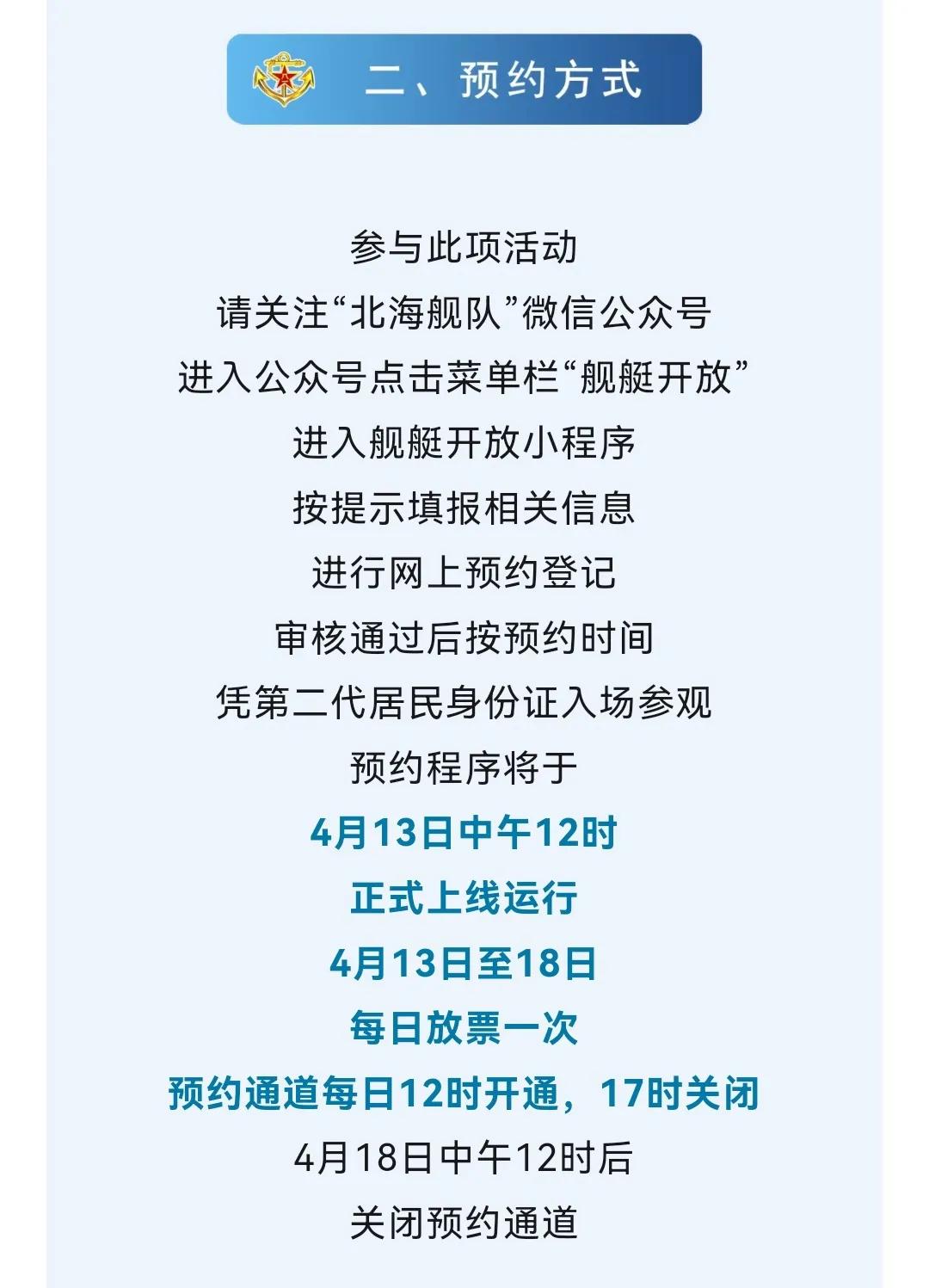 随着每年一度的海军节日益临近,北海舰队和南海舰队都已经宣布要举行舰艇开放日活动,地点就选在了青岛市、广州市、湛江市和北海市。 对此我想说,现在压力给到了东海舰队,如果东海舰队也举办舰艇开放日活动,那么我觉得可以放在以下几个城市举行,这些城市分别是,宁波、舟山、厦门、上海。 当然作为一个生活在宁波的军迷,我还是希望能够在宁波举行海军舰艇开放日活动,因为这很方便。