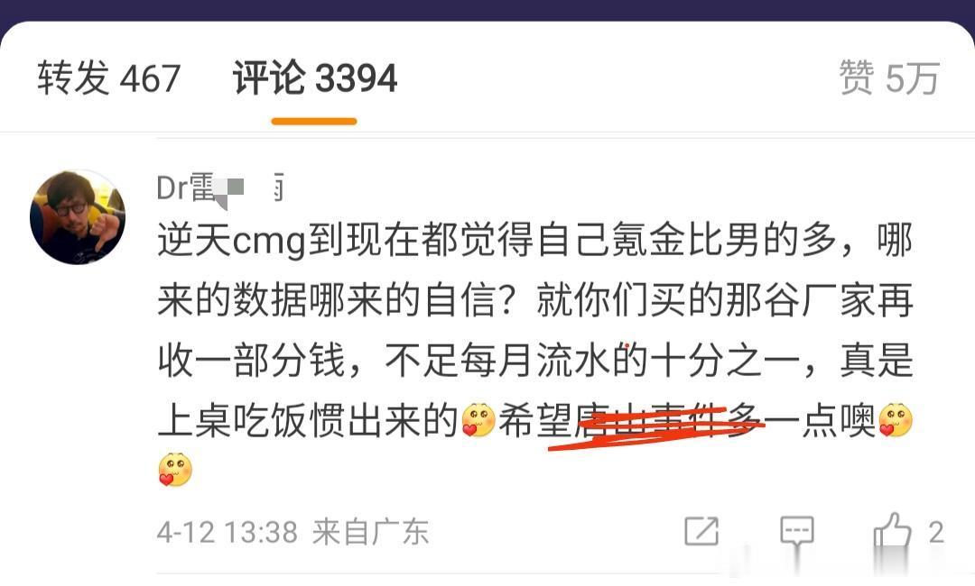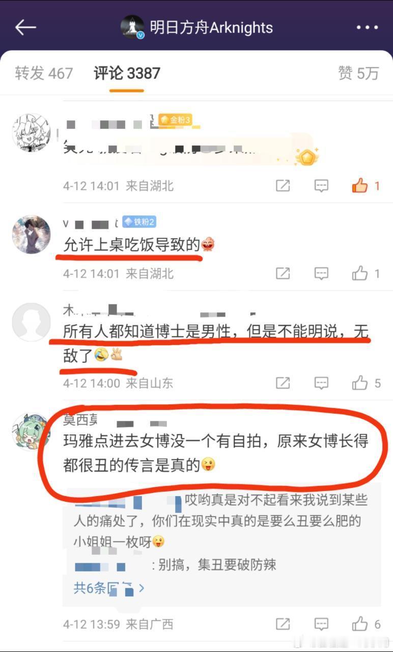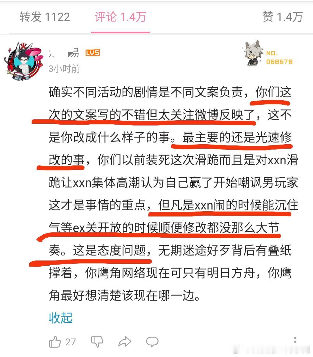 在b站上,方舟的更新公告下面也有大量评论声称“不保留文案里的先生”,他们就要停氪甚至退游。里面有一位说了实话(图八):他们觉得方舟的策划对女玩家的想法过于看重,男玩家感到没面子。