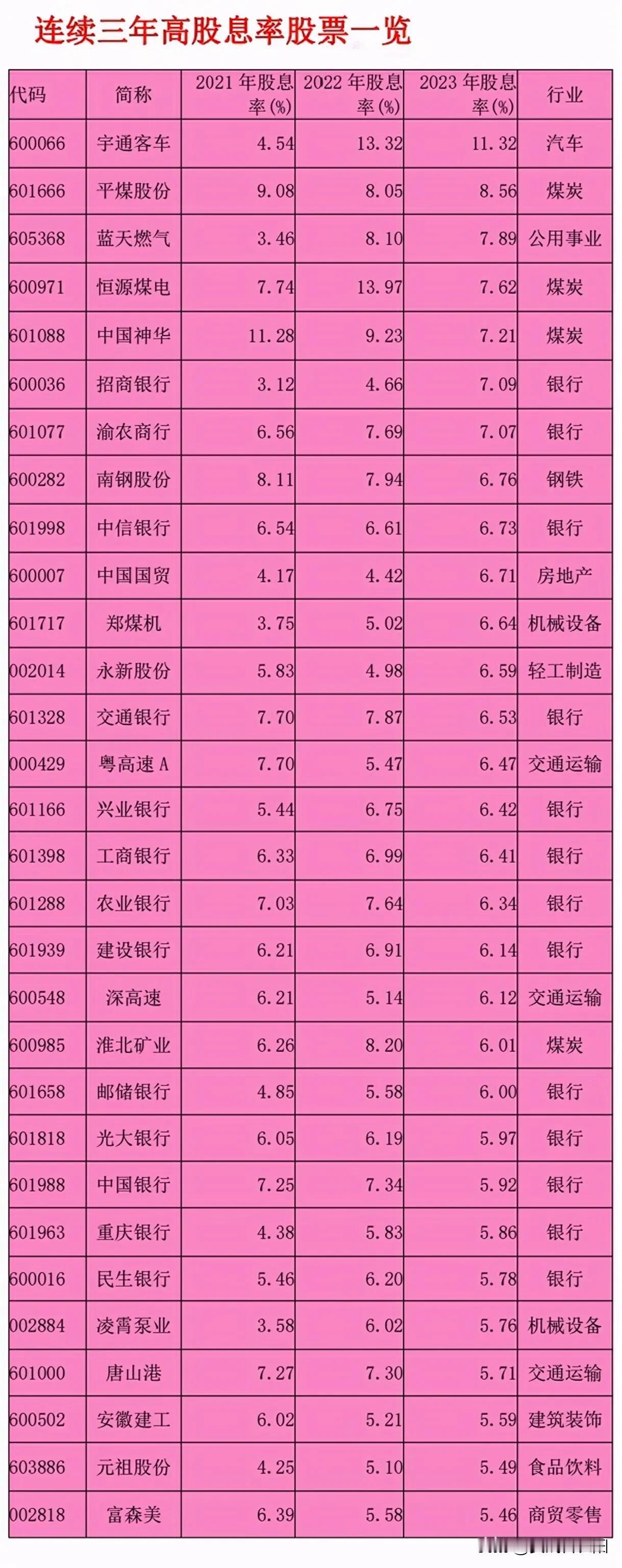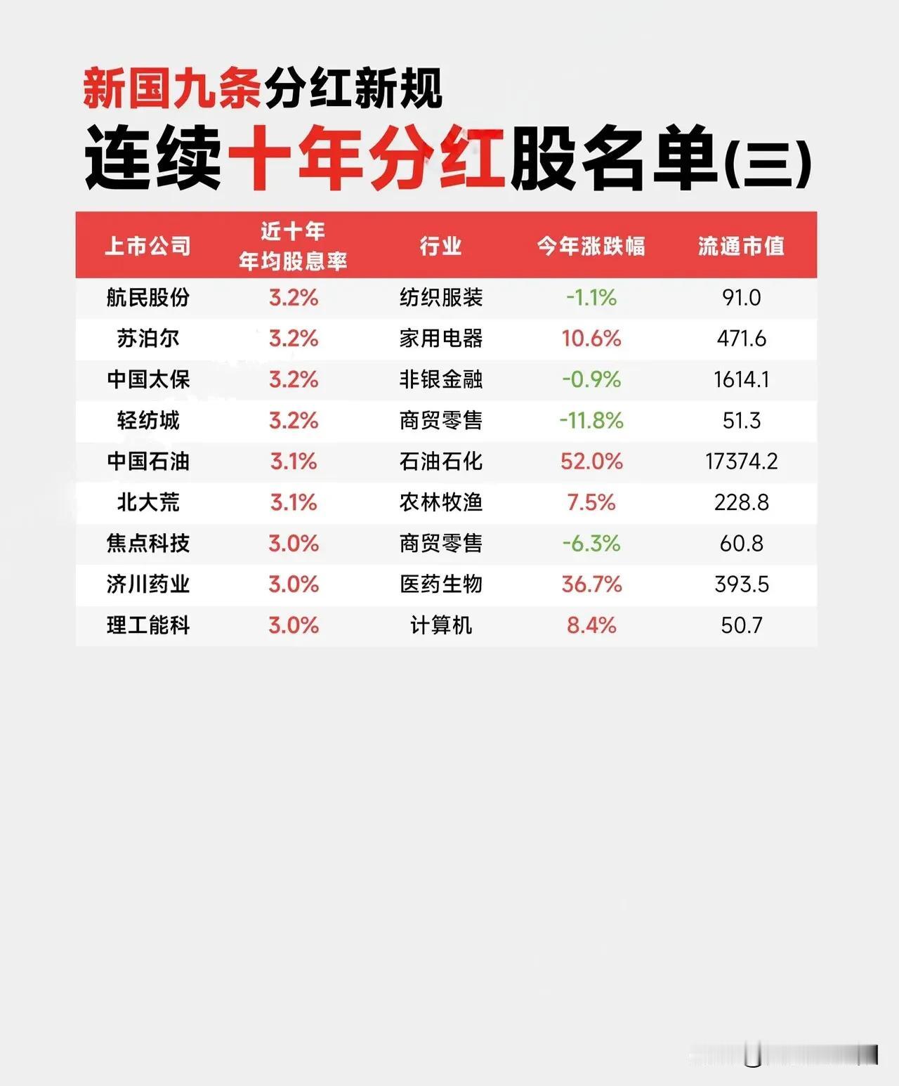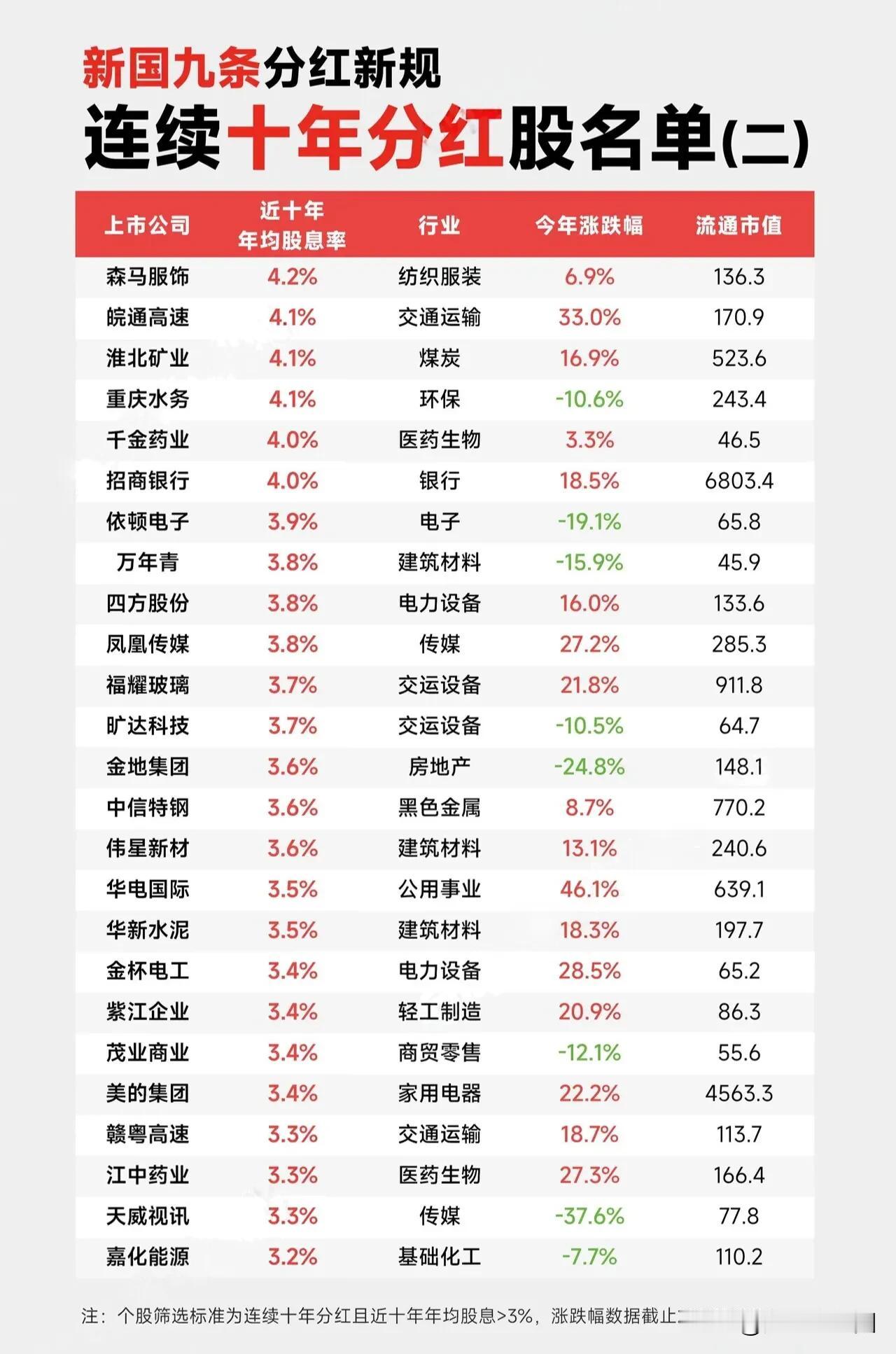 新国九条后,业绩好分红慷慨的上市公司将成为A股市场的主角。不惧怕大盘震荡可穿越牛熊。看看常年高息股中国神华、宇通客车就知道了,去年大跌的时候都不跌,股价不断创新高。连续十年分红高息股名单和最近三年连续分红高息股名单