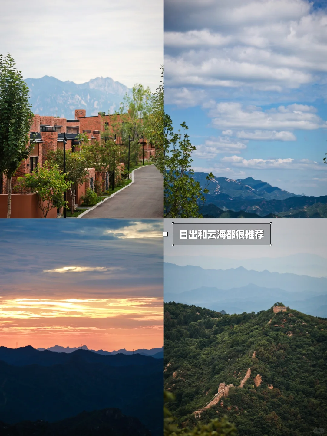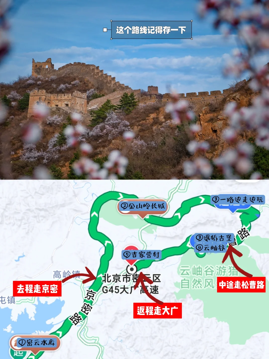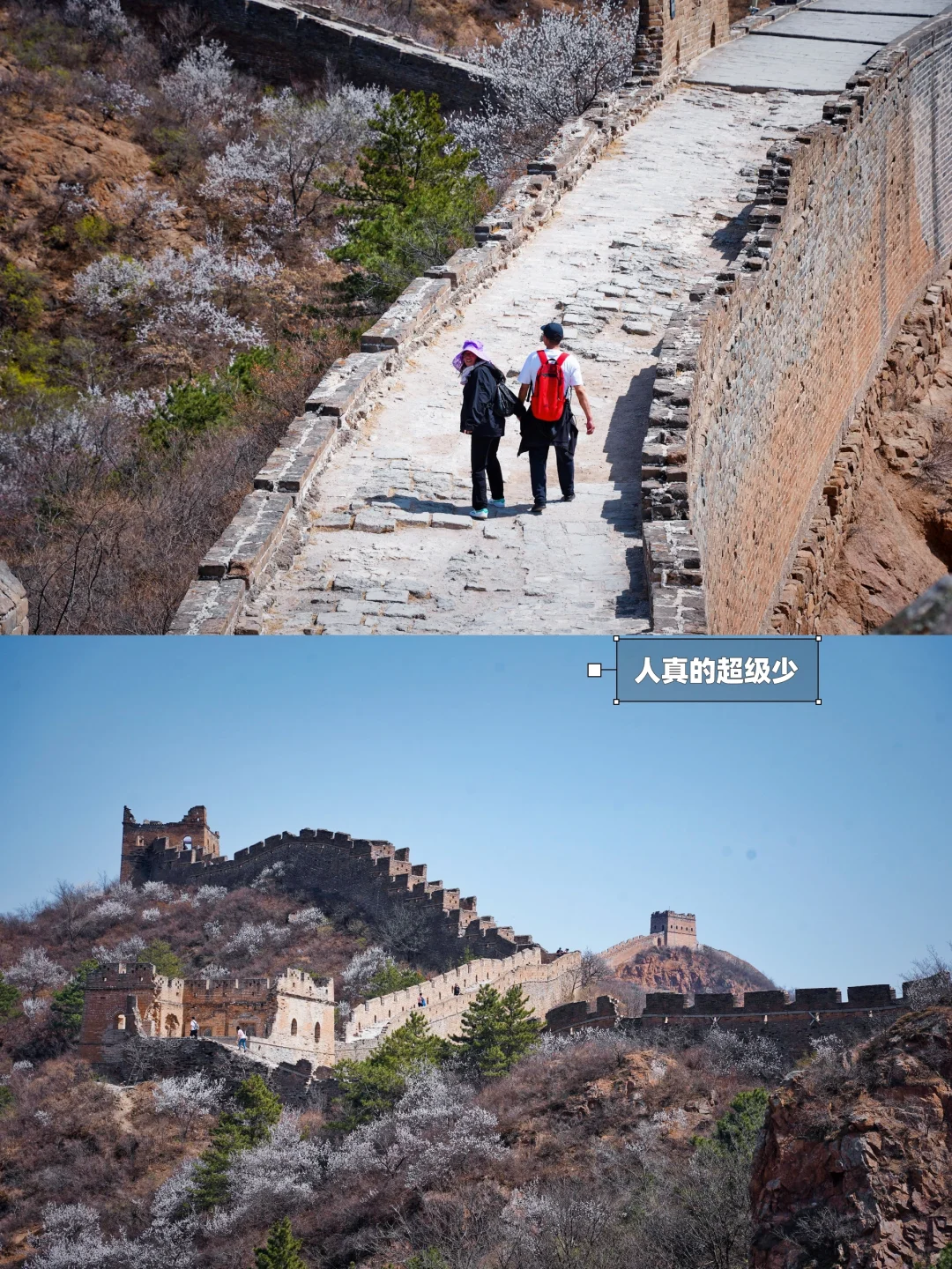 北京周边的大大小小长城 金山岭这一段可以说是玩法最多的 特别是怀柔-密云-古北口-金山岭这条路线 只需2天1晚,可爬长城/看水库/徒步露营 金山岭长城人少,体验佳 五一可以看过来! . ⏺行程安排 建议2天1晚的行程,建议去密云看看海,去金山岭长城,看古堡和古村落,地图在最后一张 D1-密云水库-金山岭长城-住 D2-金山岭-遥桥古堡-吉家营村-返程 . 1⃣金山岭长城 “杏花映长城 · 杏韵金山岭”,最近的杏花正当时,满山都是白色的杏花,像瀑布一样,真的很壮观。可以傍晚去看日落,然后直接住在景区附近的民宿。 ①关于上山下山:上下山都有缆车可以省力一些,不过下山的缆车不太好找,建议下山自己走。如果有老人小孩,那就毫不犹豫地选上下山缆车吧。 ②关于路线:金山岭全程爬完大概要4-6小时左右,建议根据体力情况安排,记得带上防晒和抗风的衣物。东线的景点比较多,推荐东线。 ③关于补给:长城的敌楼里有卖水和零食的,比较贵,建议自己带。 . 2⃣遥桥古堡+云岫谷 密云区新城子乡遥桥峪,山谷、小溪、瀑布、森林小路,一条非常美妙的徒步路线,全程大约8-9公里,没有太多人工痕迹,极富野趣,可以顺便再去旁边的遥桥古堡转一圈吃个饭。 . 3⃣吉家营村 吉家营村还保存有古城门、古庙、古井、古牌坊、古宅、古树,村内保存下来的东、西两个城门(现为国家级文物保护单位),门头上分别题有“镇远门”和“吉家营门”。 . 4⃣密云水库 邑仕酒庄、上安村都很合适,前者也是公园年卡可用,后者就是免费的村落,两个地方都可以站到制高点俯瞰密云水库,视野真的非常好。 . 🌁来金山岭长城游玩的时候,我还受邀参与了度小满联合人民日报文化传媒在滦平县发起的“向美而行,益起助微”项目,项目在金山岭开展电商公益培训,教村民如何用新媒体宣传自己的家乡。大家分组进行拍摄录制,希望通过这个活动,能有更多人关注到金山岭长城,让当地的文旅产业发展得更好。我也跟着偷学了几个小技巧🤭