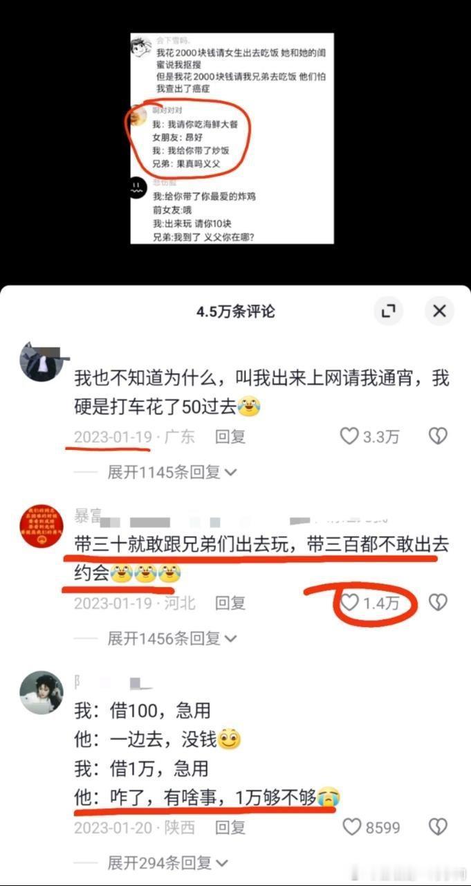 从去年开始,在短视频平台上就流行一类视频,典型的文案是 “200块请女神吃饭,女神爱答不理;20块请兄弟吃路边摊,兄弟叫我义父”。当时这种嘲讽“女生拜金”的视频,评论区里只有“兄弟们”的声音(图一,图二)。