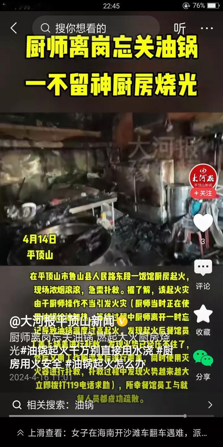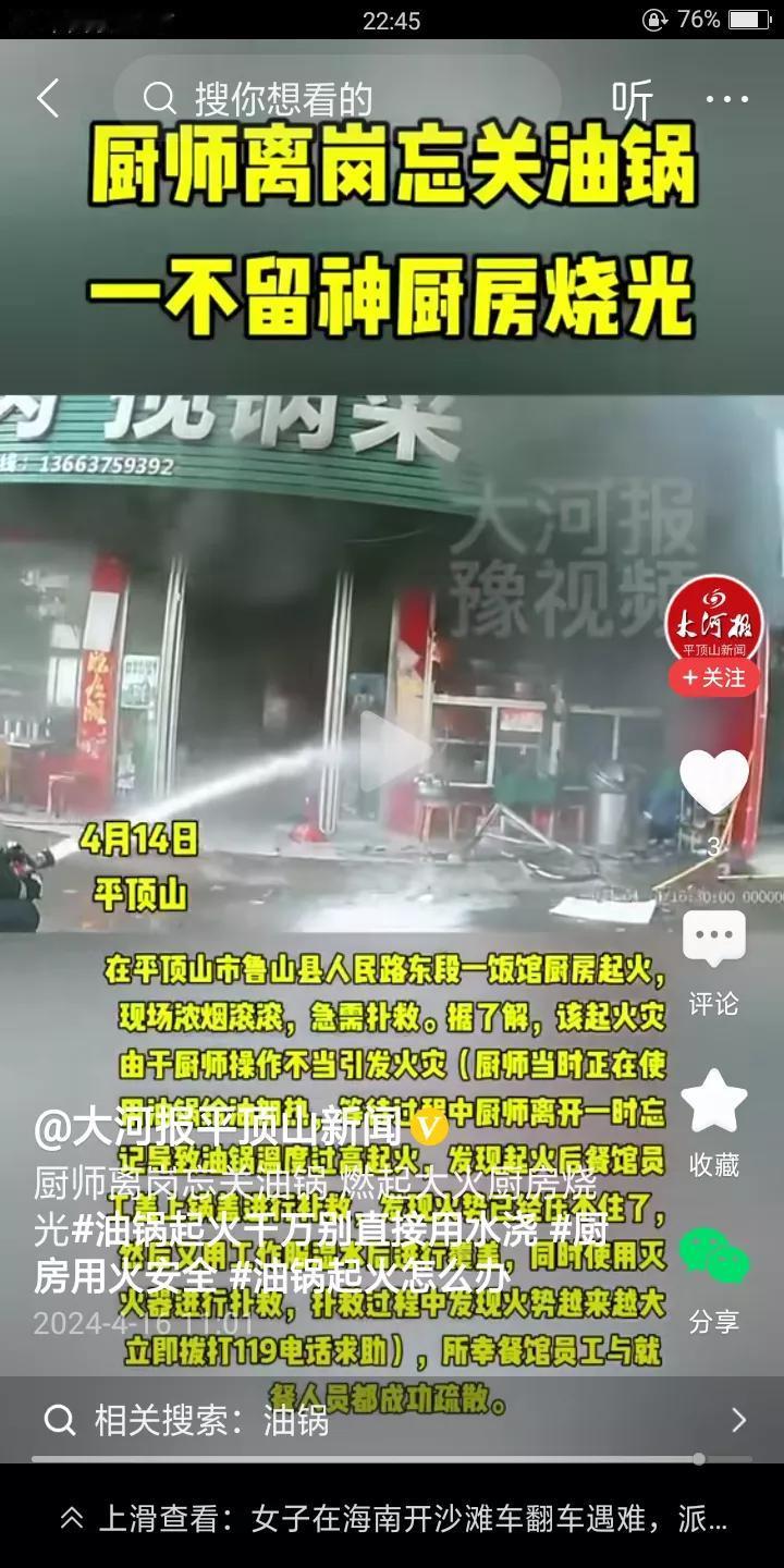 安全第一啊!平顶山一饭店就发生了意外,一厨师竟然忘了自己在厨房开着油锅,他出去的空隙,油锅着火把饭店里面都烧了,损失好几万块呀。 老板都要哭晕了,怎么可以这么粗心大意啊!这可是大忌啊!太危险了,幸好消防官兵及时赶到,没有造成人员伤亡。 我们做饭的人一定要记住了,开着火一定不要离开,如果要离开,一定要把火关了再走啊! 我也做过同样的蠢事,开着火炒鸡蛋我就去客厅了,后来闻到一股焦味才发现没关火,后来鸡蛋吃着都是苦的,都扔了。多可惜啊!