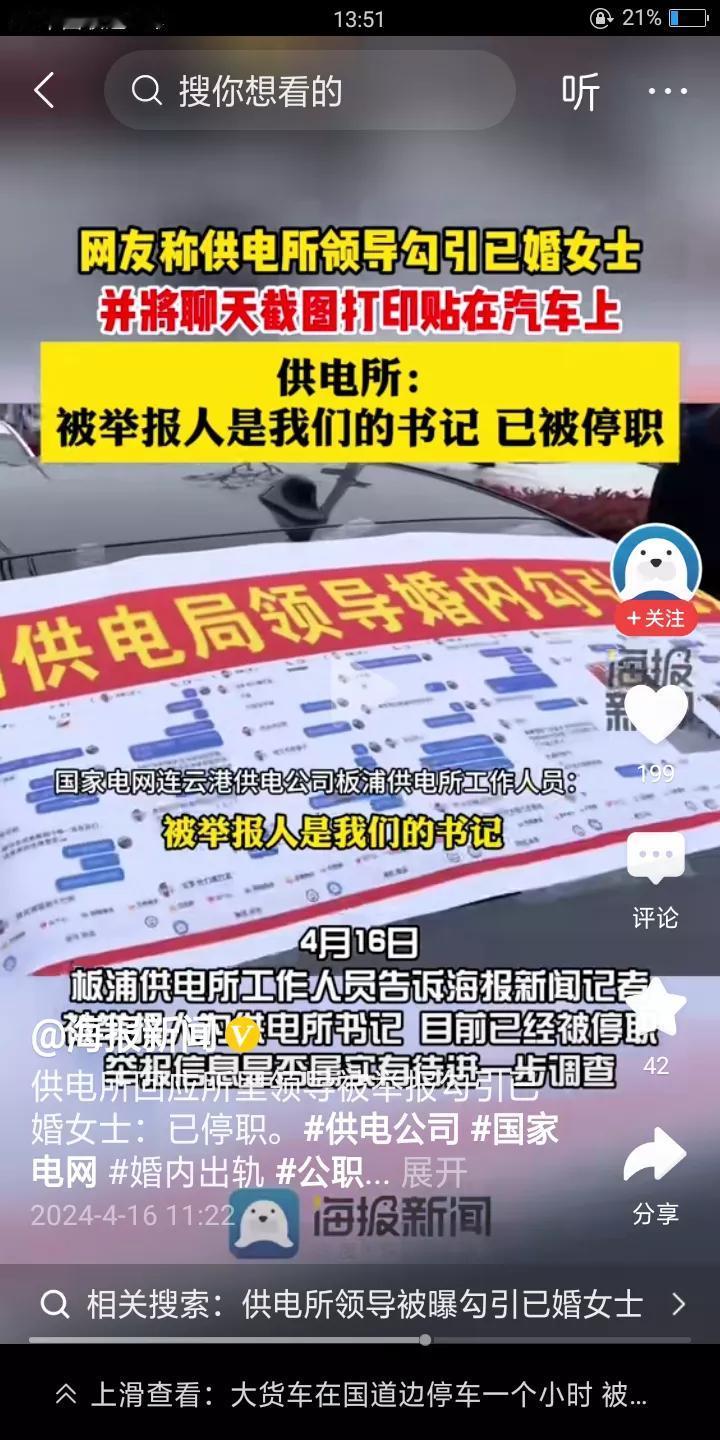 太丢人了!纸包不住火啊!出轨还是被发现了啊!玩火自焚啊! 连云港板浦供电所领导勾引已婚妇女,被女子丈夫在供电所门口怒拉横幅: 他说这名被拉横幅的人是供电局书记,现在已经被停职调查了。 这位丈夫不吵不闹,可见情绪足够稳定,换做别人,可能这位供电局书记早没命了吧!做出这样的事让家人情何以堪啊?黄安昨天还调侃自己40多就已经不好色了,也写不出好歌了,因为自己看美女,美女却在看手机,没意思啊!好多男人也说自从阳了以后,好像自己不近女色了,对那方面都没了兴趣了,特别是40多岁的中年男人,不知道有的人怎么就不一样啊! 有的人在路边看到美女还是很心动啊,看看这位大佬级别的,差不多也是40岁了吧,不知道他怎么想的啊!不怕曝光了自己难堪吗?