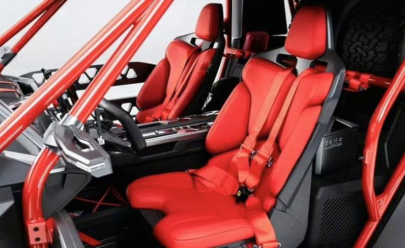 【猛士M-HUNTER更多官图/信息公布 将于北京车展亮相】新车是面向全球顶级越野玩家打造的“极限性能私人藏品”,配备了多种军工级黑科技以及航空级碳纤维材料。据悉,新车可量产售卖,将于北京车展首发亮相。 外观方面,新车整体造型参照了类似UTV硬核越野车的理念设计,全车覆盖大量碳纤维材质,大灯组采用X样式的LED日间行车灯,前格栅上还内嵌了可发光的猛士LOGO,极具辨识度。新车前包围也采用了钢制护杠设计,造型粗犷,并配有两个红色的拖车钩以及中置的电机绞盘装置。【来自懂车帝车友圈】