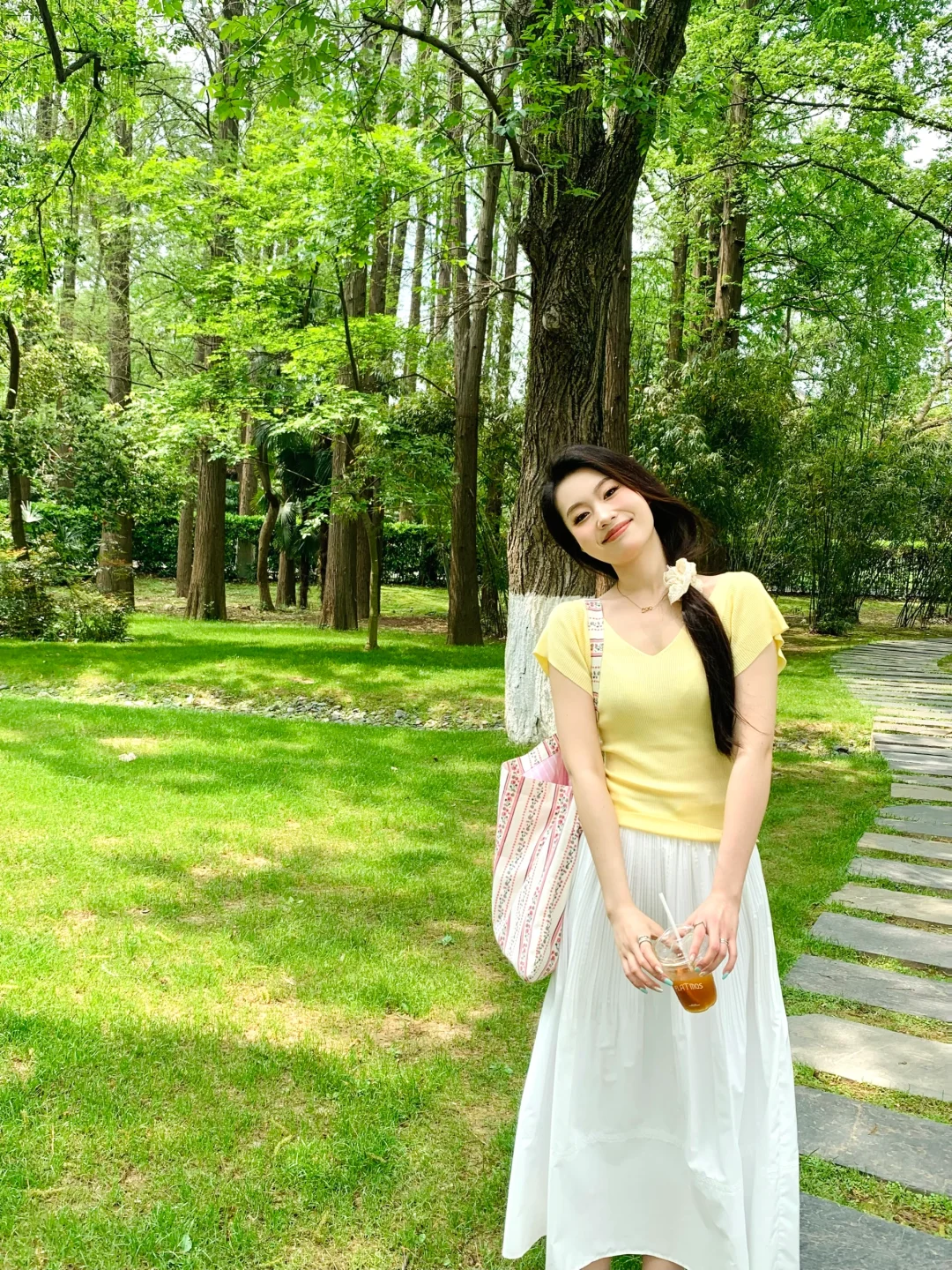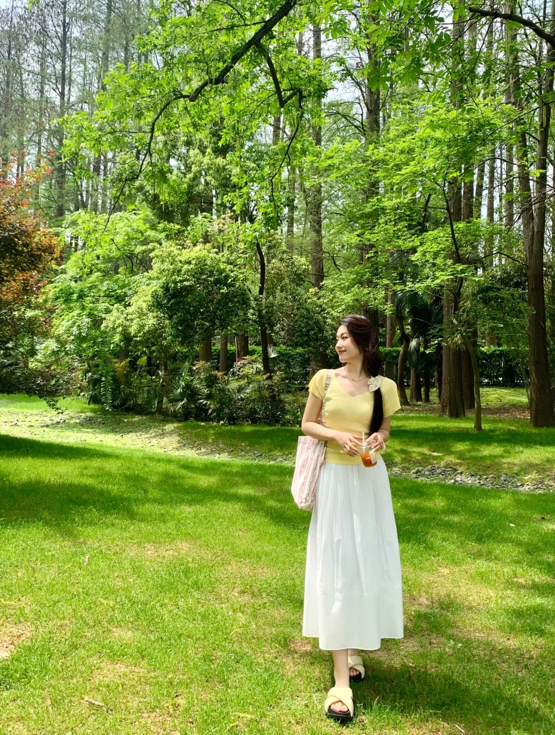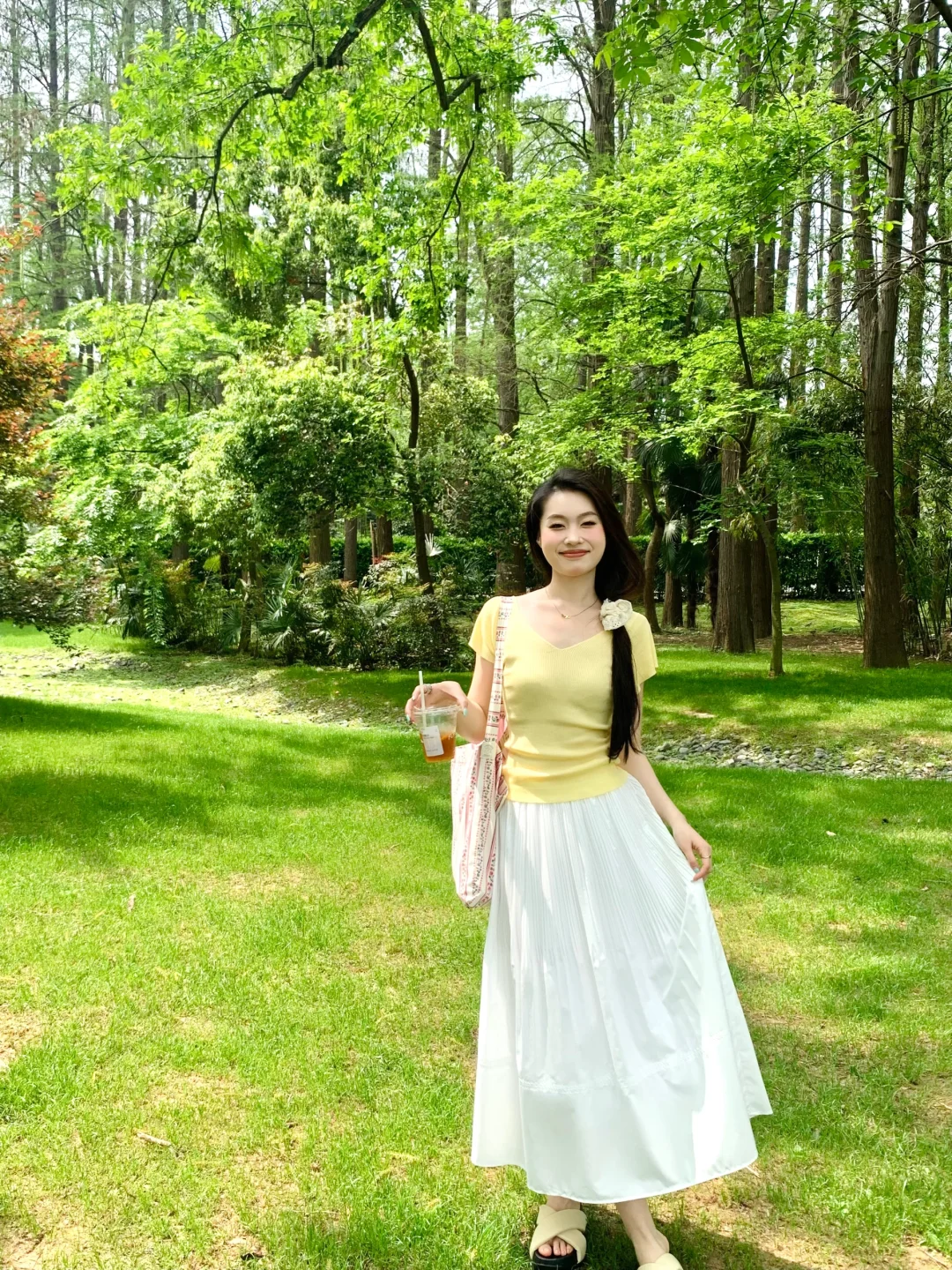 抓住武汉难得的晴天 去森林吸氧啦!!☀️ 简单休闲风穿不腻~ 清爽舒适✨ 上衣,针织短袖滑滑的,太舒服啦!![举手R]夏季不闷热!奶黄色是春夏的颜色,好衬肤色!!✅ 半身裙,我爱的白色半身裙~[黄金薯R]怎么搭都好看![集美R]百褶设计不显屁股,不显胯,高个子 梨型身材姐妹合适!!✅ -