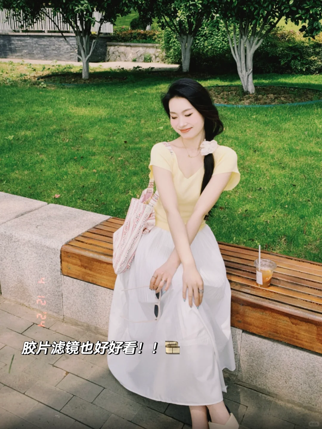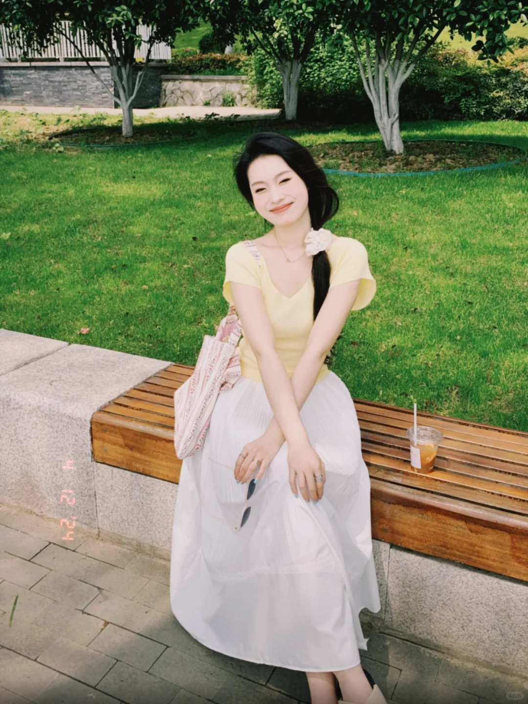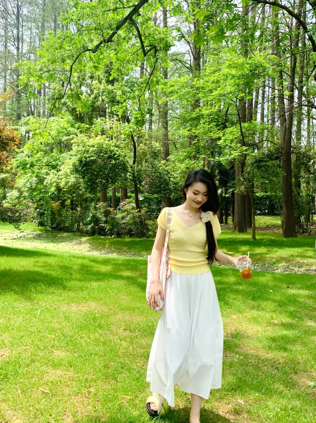 抓住武汉难得的晴天 去森林吸氧啦!!☀️ 简单休闲风穿不腻~ 清爽舒适✨ 上衣,针织短袖滑滑的,太舒服啦!![举手R]夏季不闷热!奶黄色是春夏的颜色,好衬肤色!!✅ 半身裙,我爱的白色半身裙~[黄金薯R]怎么搭都好看![集美R]百褶设计不显屁股,不显胯,高个子 梨型身材姐妹合适!!✅ -
