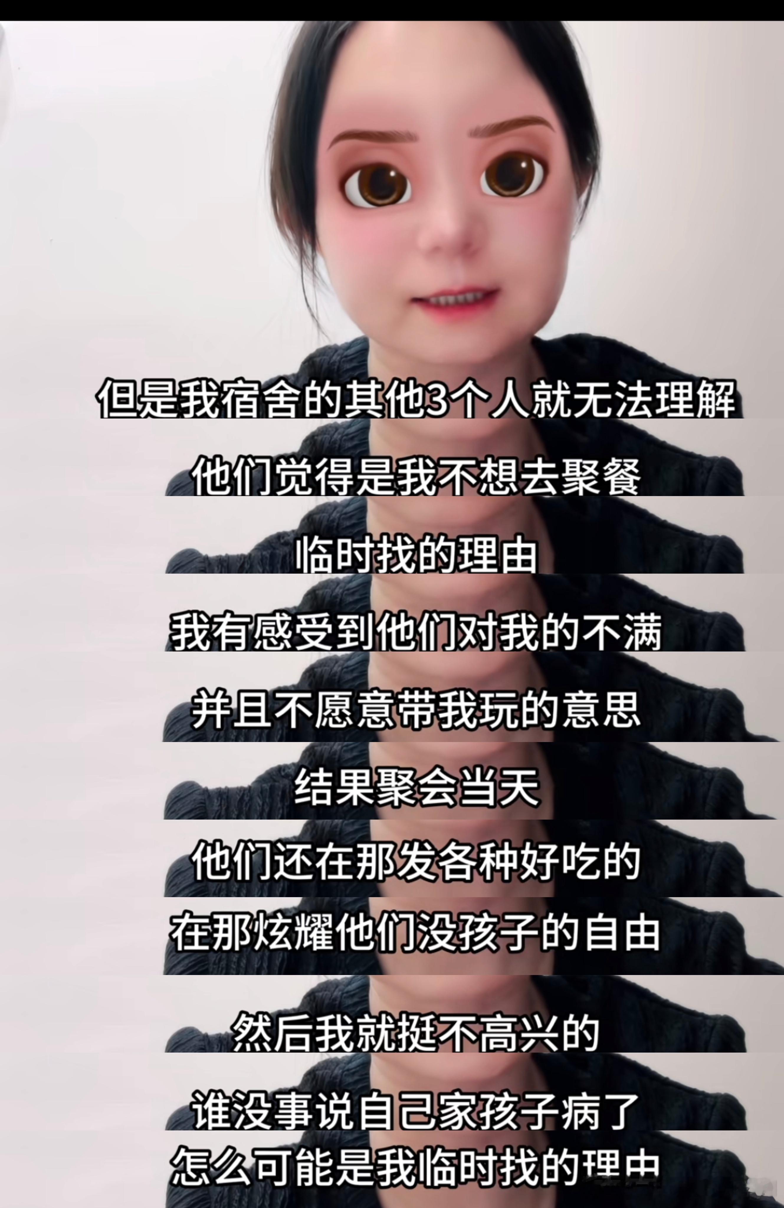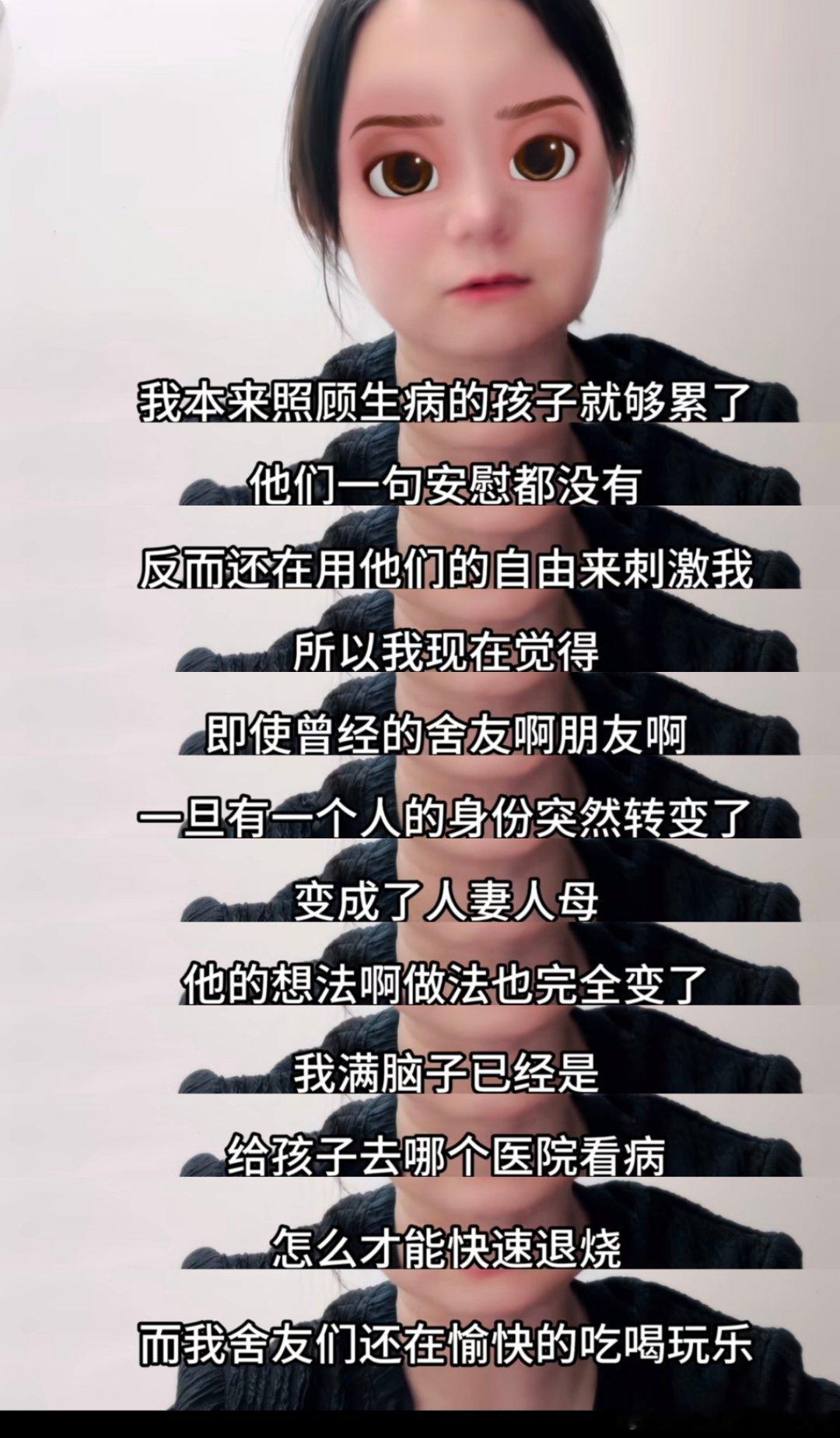 不是吧?自己放了室友约定好的聚会鸽子,还要怪她们愉快地吃喝玩乐,不来安慰你。[疑问]怎么全程没提你那个凤凰男老公呢?