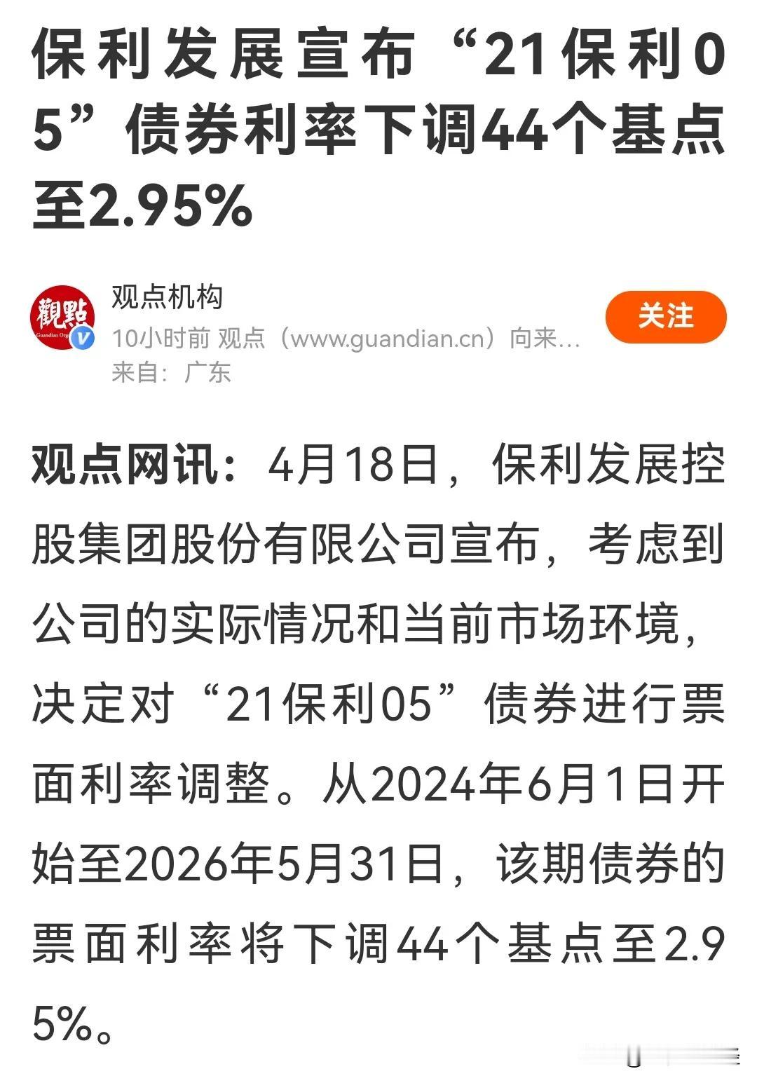V5!保利发展宣布“21保利05”债券利率下调44个基点至2.95%。强势的休现!资产荒,保利才敢于说“不”。