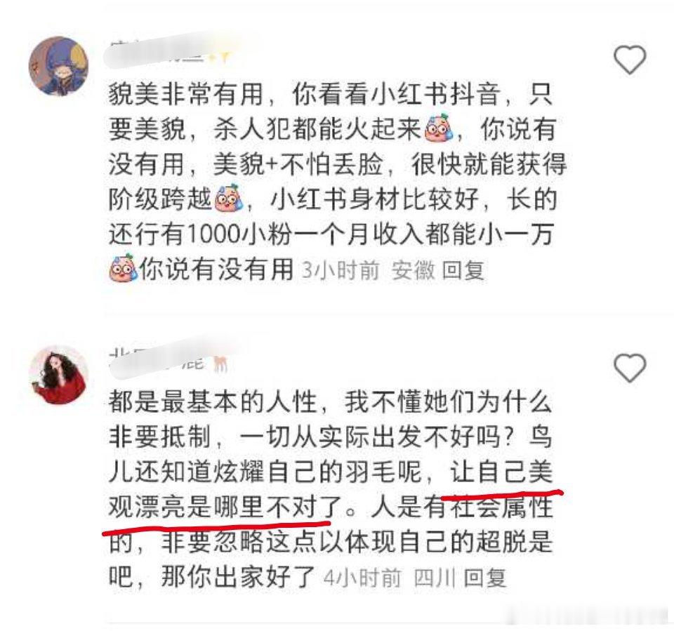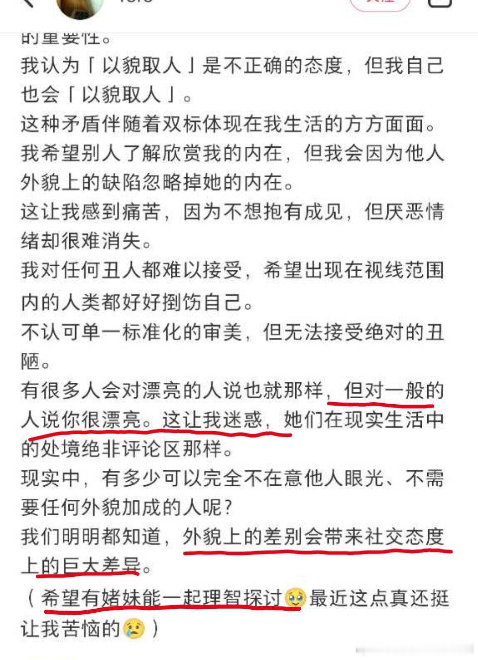 说自己视线范围别出现丑人,希望他们好好捯饬自己,结果只在小🍠(一个女用户占比多数的软件)开了一个“女性主义”讨论贴,这些话你敢跟男人说吗?敢去虎扑,贴吧宣传吗?敢推销他们买昂贵的化妆品护肤品吗?会给他们制造容貌焦虑吗?如果你一时同仁地都做了这些事,你再看看是不是你8u的兄弟们骂得更狠。