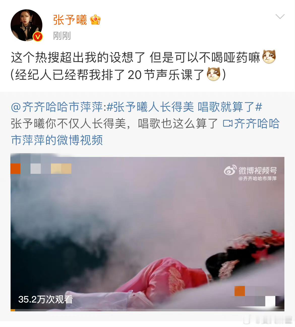 #袁娅维让张予曦不用喝哑药# 袁娅维转发张予曦回应“人长的美 唱歌就算了”的微博,回应要给张予曦安排声乐课!!一对一私教安排上了[送花花]!期待下一次合作舞台吧!两个人一起惊艳全场![爱慕]