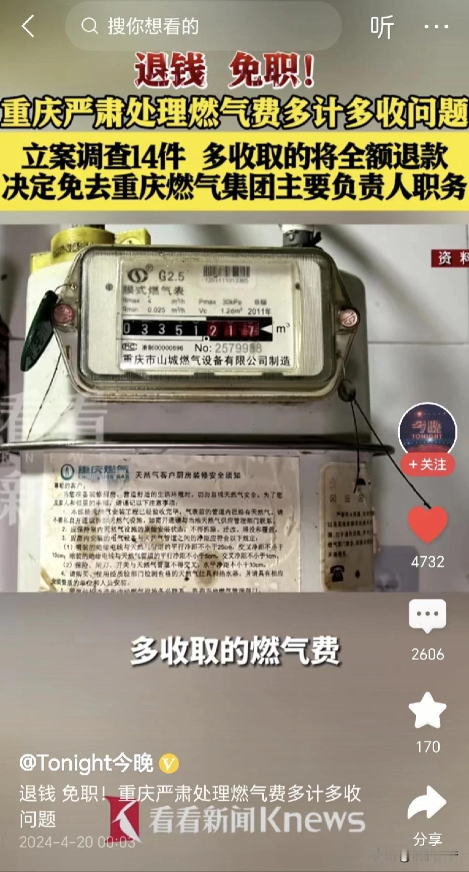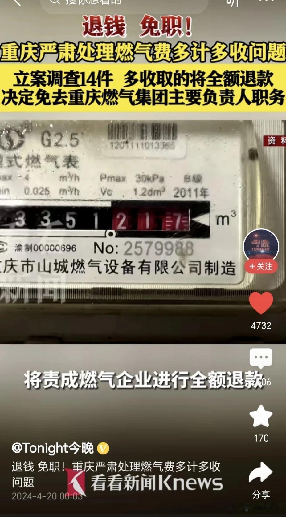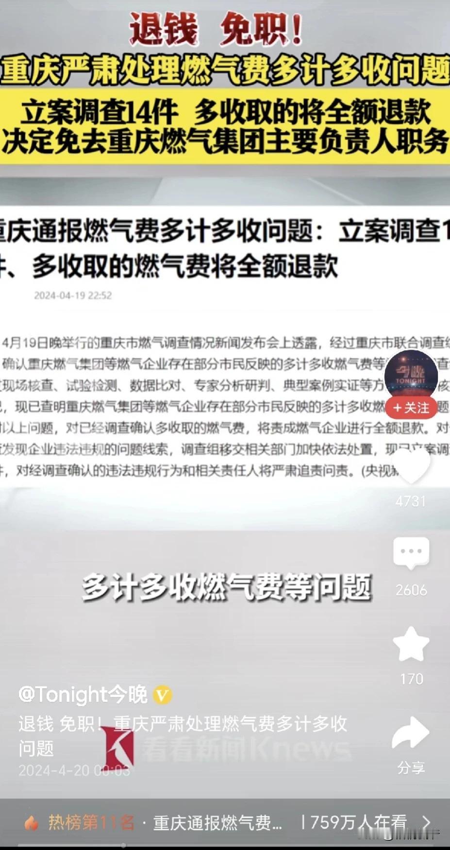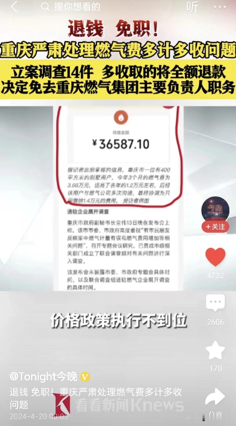 根据4月19日晚上的通报,重庆燃气存在的问题包括:错抄及违规估抄、计费周期混乱、价格政策执行不到位、换表工作组织无序、工作力量不足、内部监督管理不到位。 这些问题长期存在,说明重庆燃气的管理非常不到位,某些管理者尸位素餐,拿着高薪不干事,甚至把老百姓当做“提款机”,毫无法纪意识,任性妄为,必须依法依规严惩。 燃气、水电等属于民生领域的公用事业,应该秉承微利保本的经营原则,不得以赚取高额利润为目标。很显然,重庆燃气违背了为民服务的初心,盲目追逐高额利润,加之其管理混乱,造成了严重的后果,可悲可叹! #重庆通报燃气费多计多收问题#