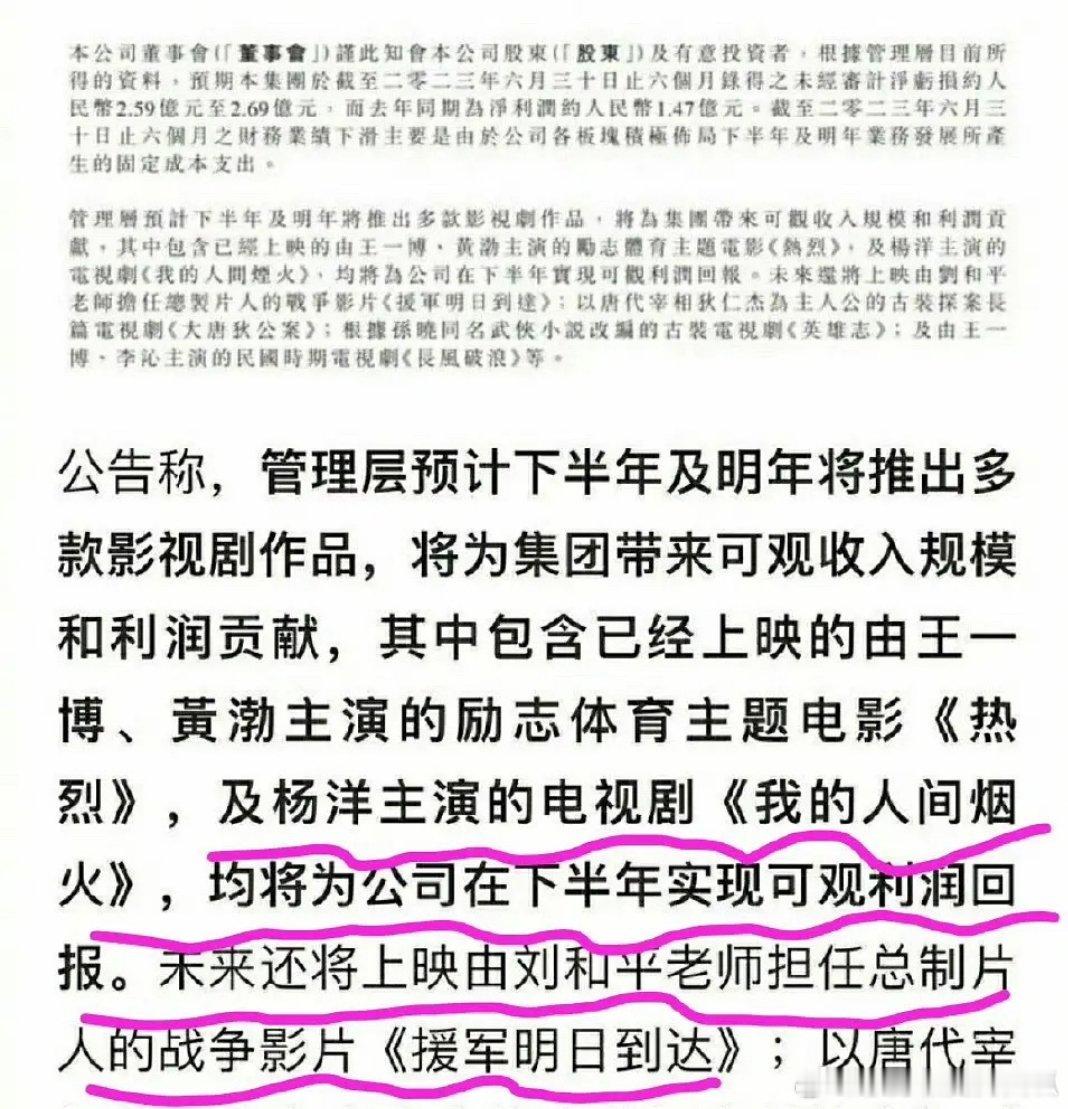 中国儒意2023年年报显示: 杨洋主演的电视剧《我的人间烟火》为本公司带来口碑和收视双丰收。