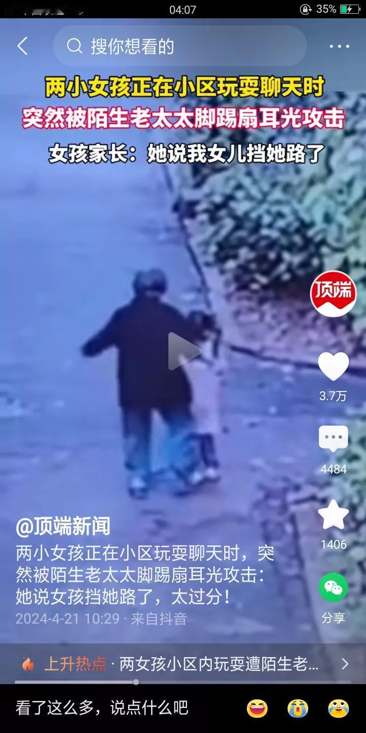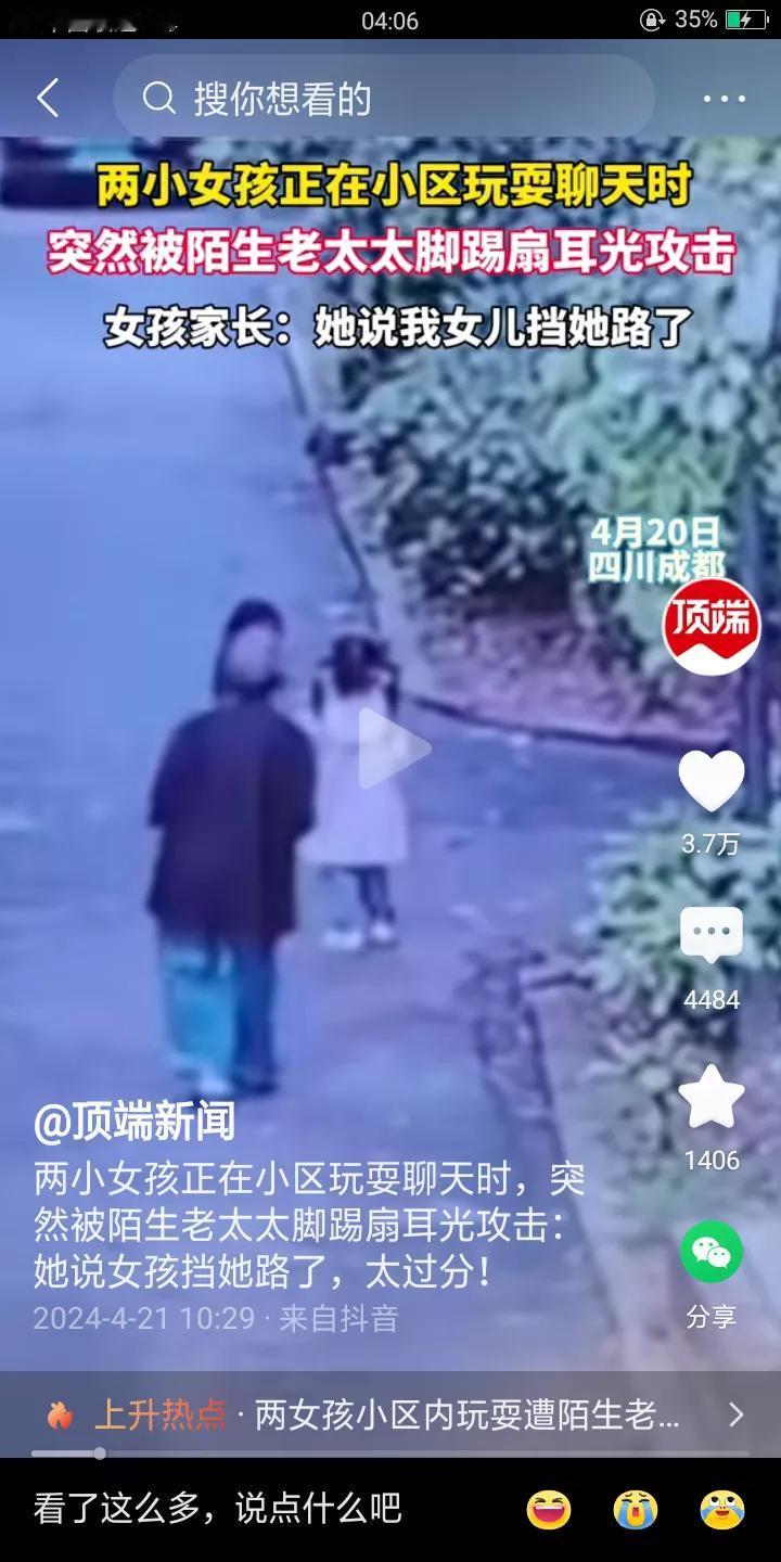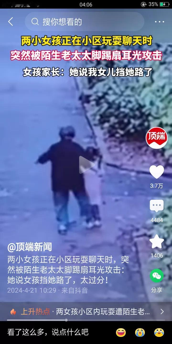 真缺德啊!这段监控视频真气人啊!这两个小女孩正在小区的路上聊天,这时走过来一个老太太,她忽然抬起脚就去踢打其中一个小女孩,另一个大点的孩子看到后赶紧也踢了一下老太太,老太太气不过,用手扇了这个小女孩。 家长调取监控后,找到了这个老人,她说是因为这两个小女孩在小区里玩挡到了她的路了,真是人老了,没有一点人样啊,太让人气愤了,看来她年轻的时候也不是一个好人啊!这都能成为理由,肯定是心理阴暗,有问题才会这样吧! 家里有这样的老人也是倒霉了,肯定家里也是鸡犬不宁啊。