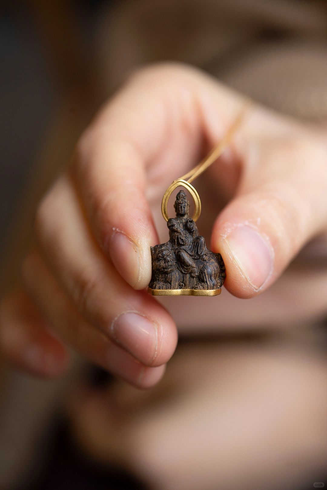 属兔的守护神 【文殊菩萨】随身佛 油脂爆满,生闻香气醇厚,花香,果香,层次丰富。 18k金镶嵌文莱黑棋沉水,品相漂亮,精雕细琢佳作。