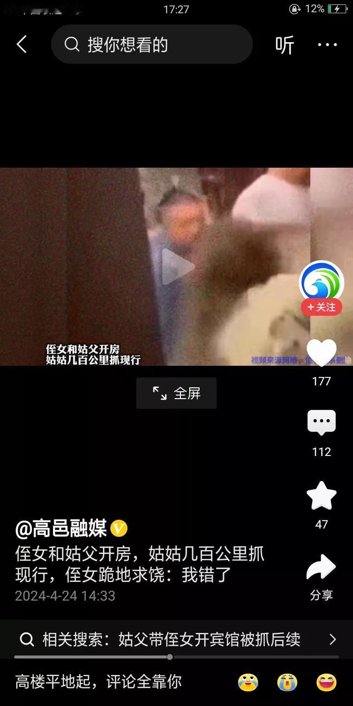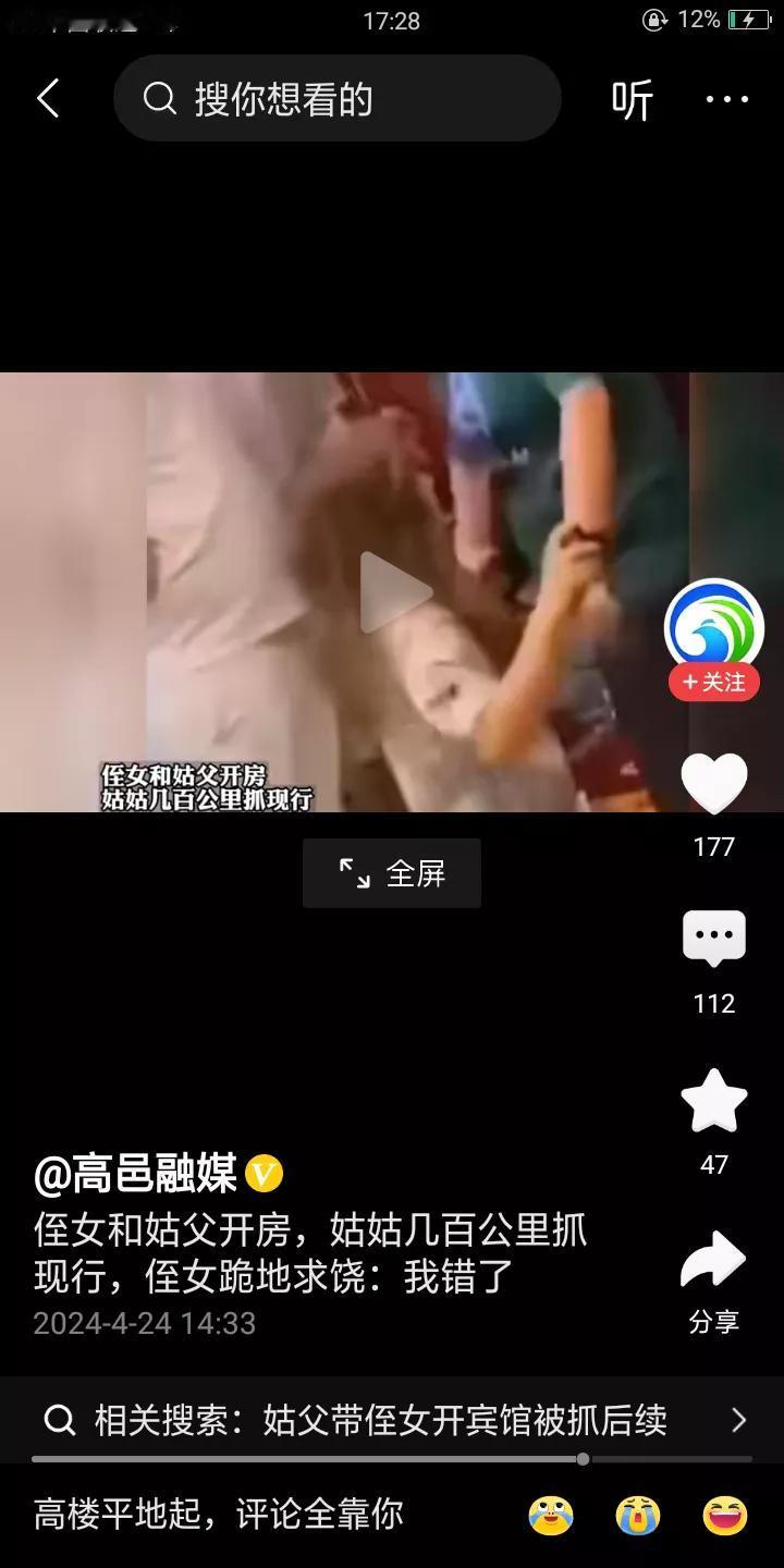 乱套了!姑父跟侄女开房,被亲姑姑几百公里酒店抓奸,气的姑姑一个劲的打小女孩,看着他姑父刚开始还想拉架,后来也不敢说啥了。 视频里你可以看到,姑父还拄着拐杖呢,现场还有其他人一脸懵逼的状态,可能是女孩的表哥啥的吧! 太狗血了,这真的是大千世界,无奇不有啊!这不是乱了辈分了吗?这以后还能好好的来往吗?肯定是老死不往来了吧! 这小姑娘也真是心大啊!不过这姑父也是的,为啥要祸害人家小姑娘啊!太不懂事了吧!这真的是丢人啊!