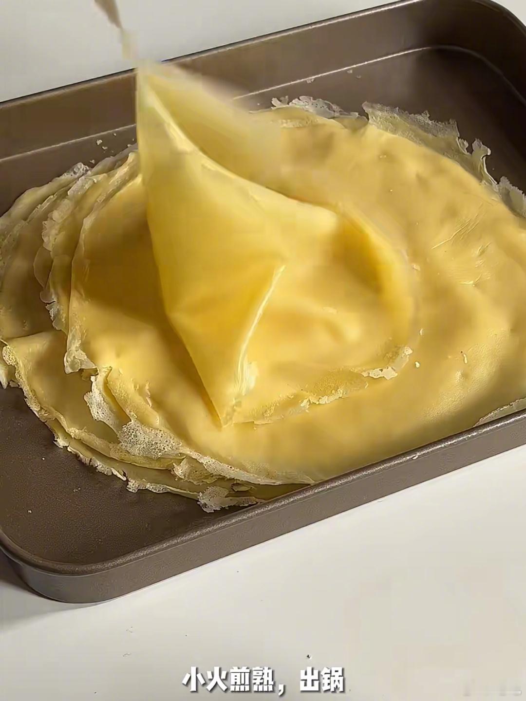 9取几张饼皮错落叠放,抹上淡奶油和芒果混合物,然后卷起。