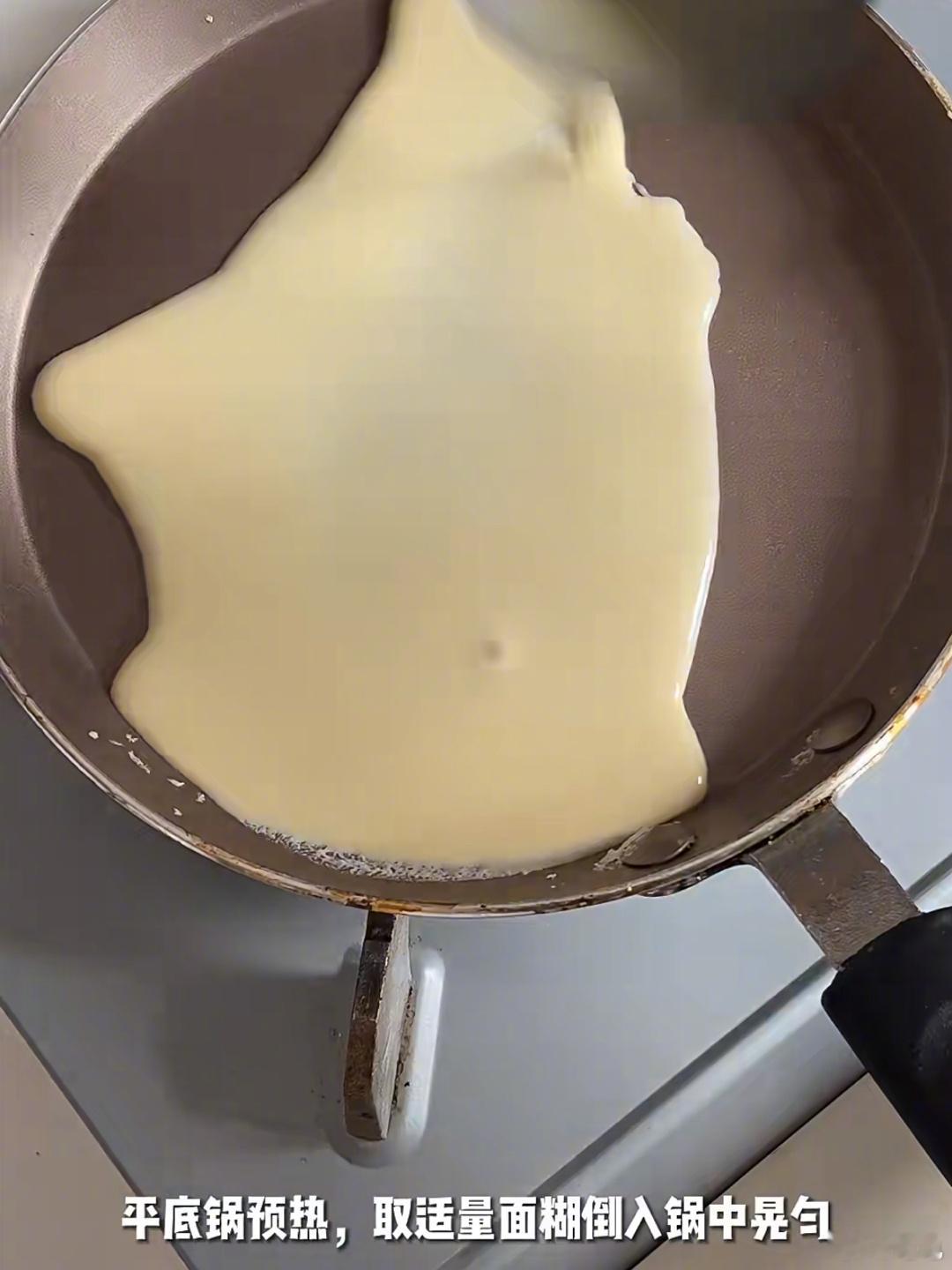 5使用平底锅摊饼,转一圈让面糊平铺