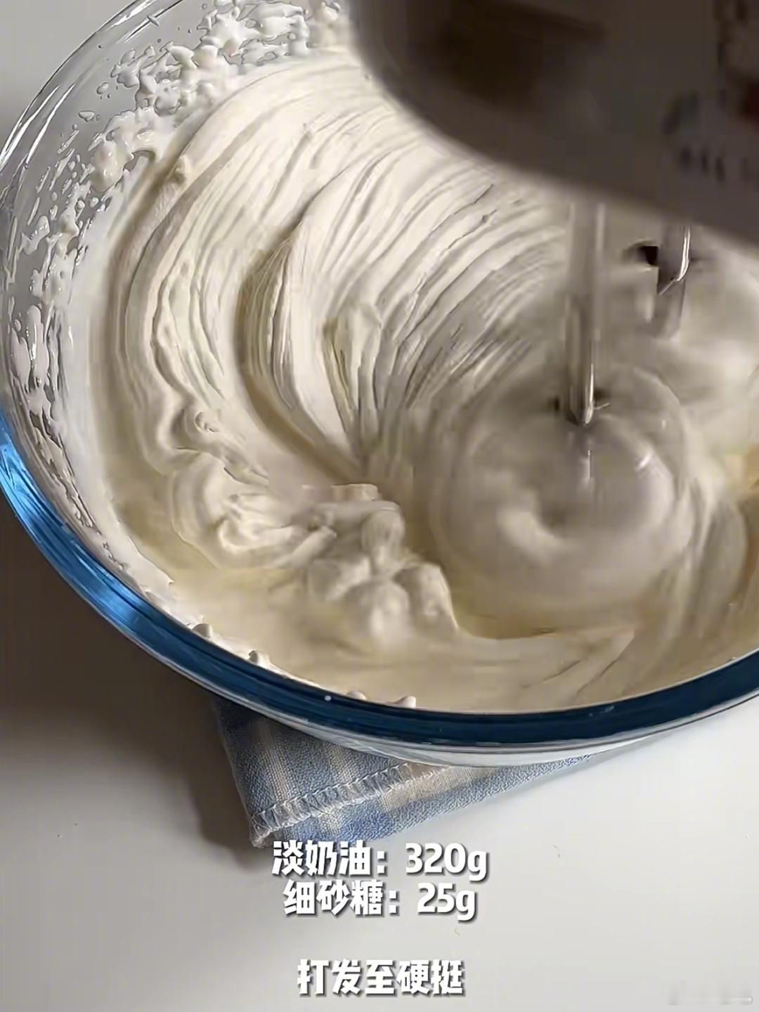 7打发淡奶油和糖,直至有弯角4。
