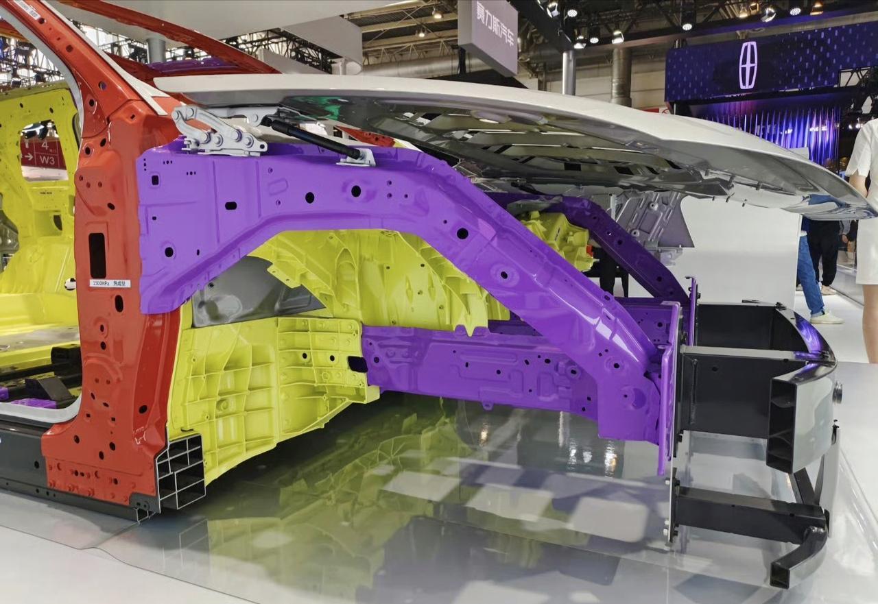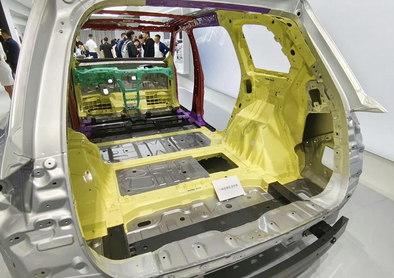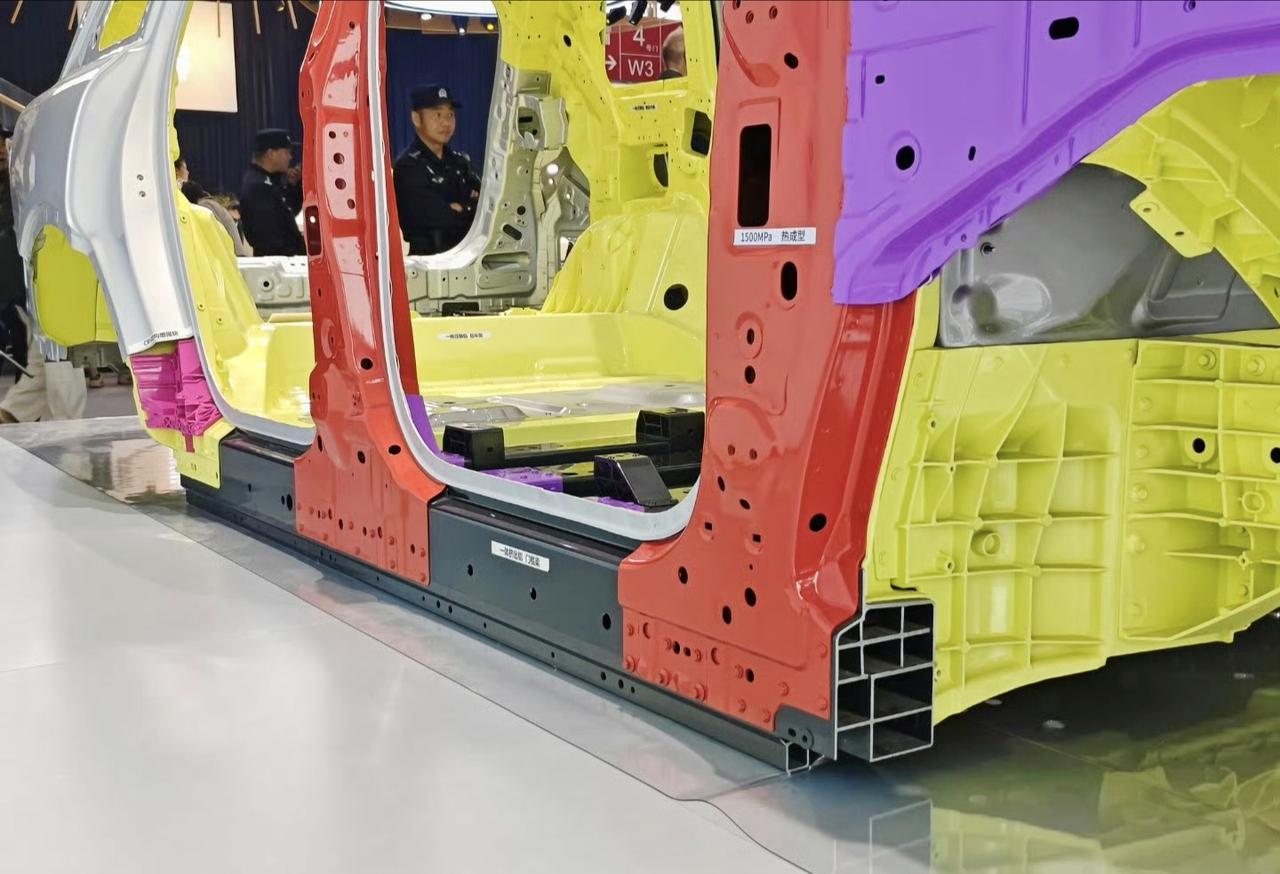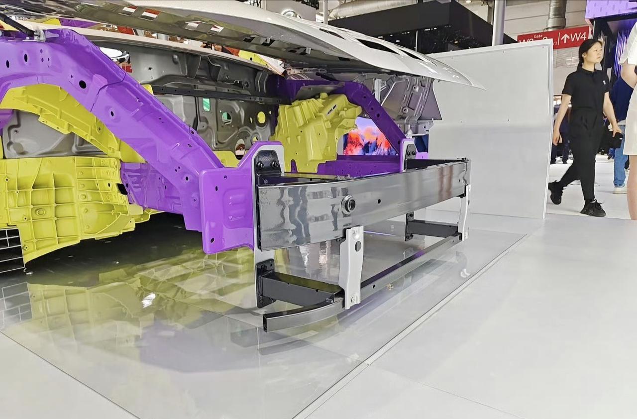 刚刚在华为展台上看了问界M9的白车身,真切感受到了一句话,有钱是真好啊。 银色上下两道目字形前防撞梁,搭配长长的扭力盒,主打一个降低低速碰撞损失。 紫色极其粗壮的两条前纵梁和上纵梁组合形成了笼式车身,既增强正面碰撞强度,也能均匀分摊车头的撞击能量。 黑色的铝挤粱同样非常粗壮,内部的多格结构可以在强化侧向碰撞强度、增加溃缩安全区域的同时,更好地保护底部电池结构。 黄色的前后车身件全部采用一体压铸,可以说是尺寸超大,可以在家化繁为简的同时,进一步提升车身整体强度与扭转刚性。 总结一下:壕无人性,强到离谱。【来自懂车帝车友圈】