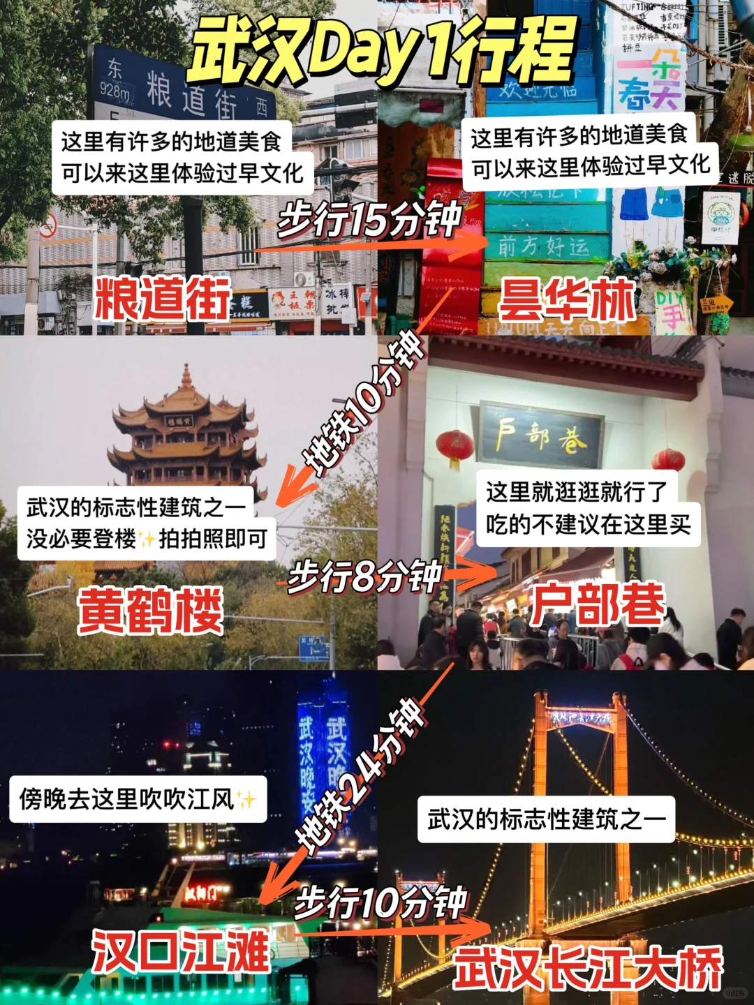 我的研究生朋友做的武汉攻略🫡太棒啦 感谢我的研究生朋友给我们做的武汉攻略,带着这份攻略去武汉小白也可以看懂~ 图1⃣️是一些武汉热门景点的分布,以及各个景点之间的一些交通时间 图2⃣️3⃣️4⃣️是武汉三日游的旅游,路线都规划好了,你还担心自己迷路嘛 图5⃣️6⃣️是武汉的一些游玩建议!!!看完在武汉少踩好多的坑 图7⃣️武汉的一些吃的,跟着吃也不踩雷