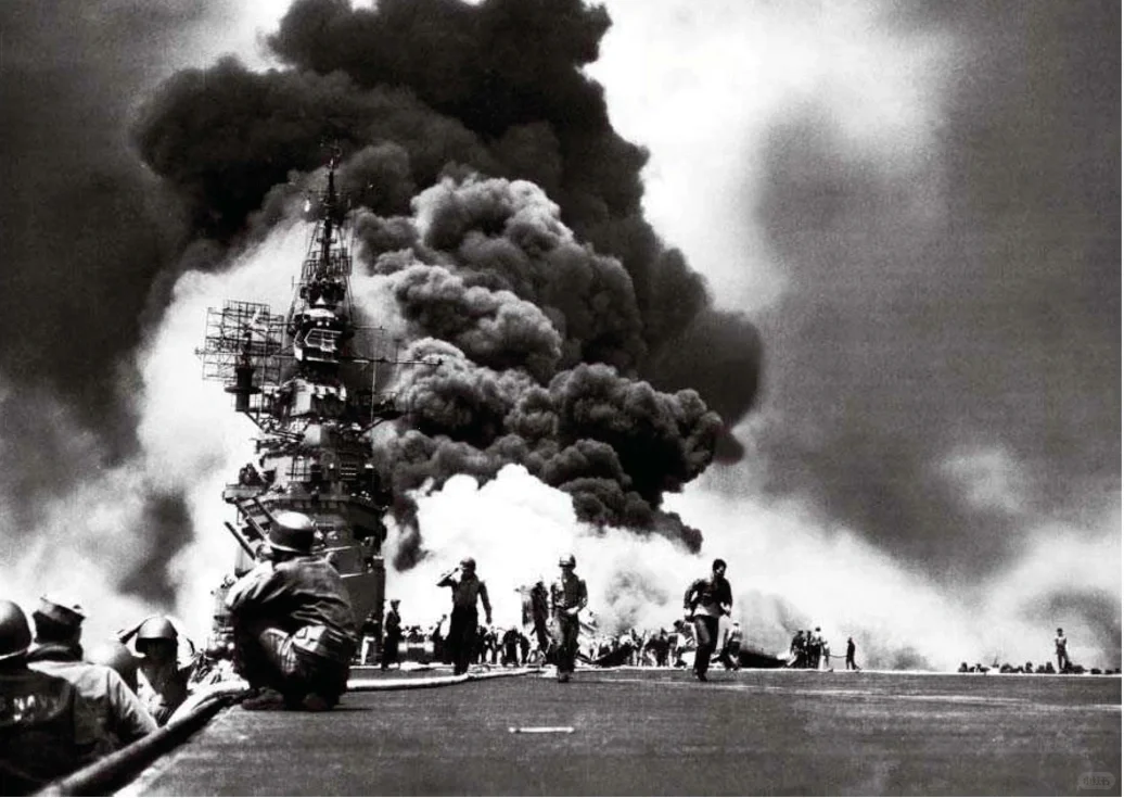 图7:1945年5月11日,太平洋战争冲绳战役,被日军神风特攻队自杀战斗机重创的美军航母“邦克山”号,汽油燃烧形成的黑烟与白色的水蒸汽一起升空