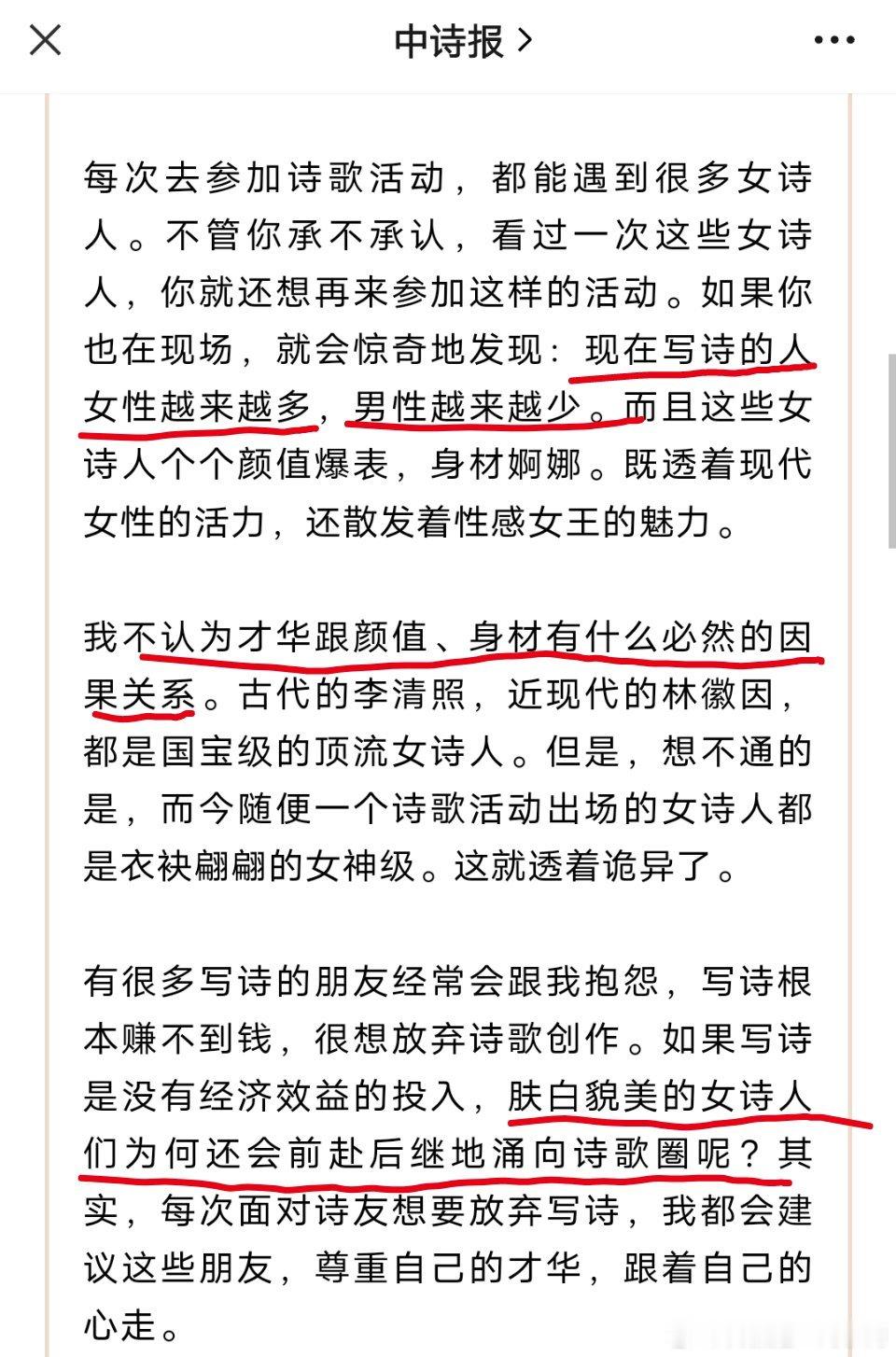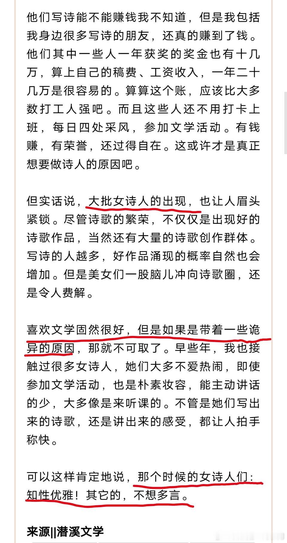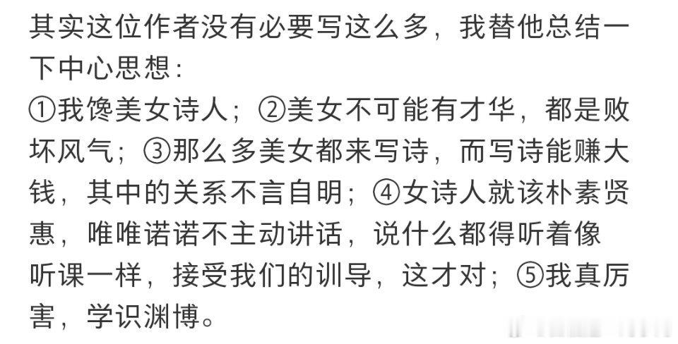 感觉是在一些比赛活动被女诗人比下去了,并且赚的还没有女诗人多,开始口吐白沫,暗戳戳地诬蔑女诗人。