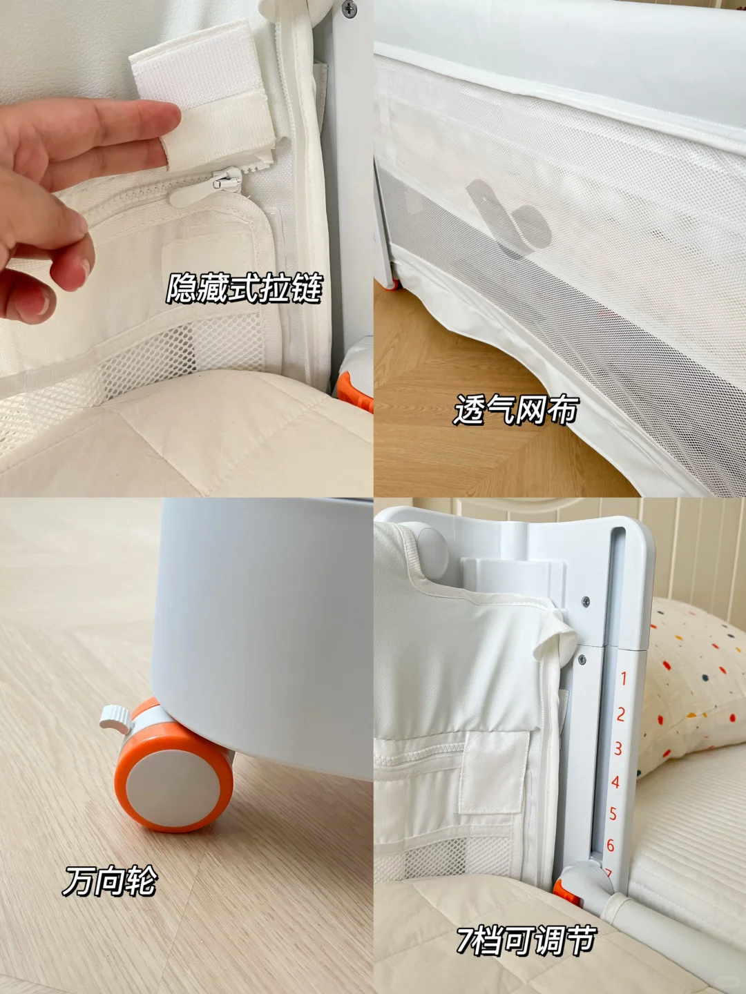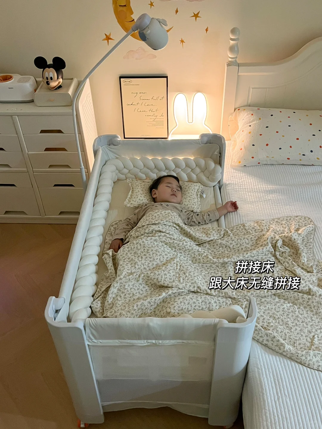 床围一侧放下来跟大床无缝拼接,晚上照顾宝宝喂奶都很方便,没有缝隙宝宝会翻身了翻滚也不怕