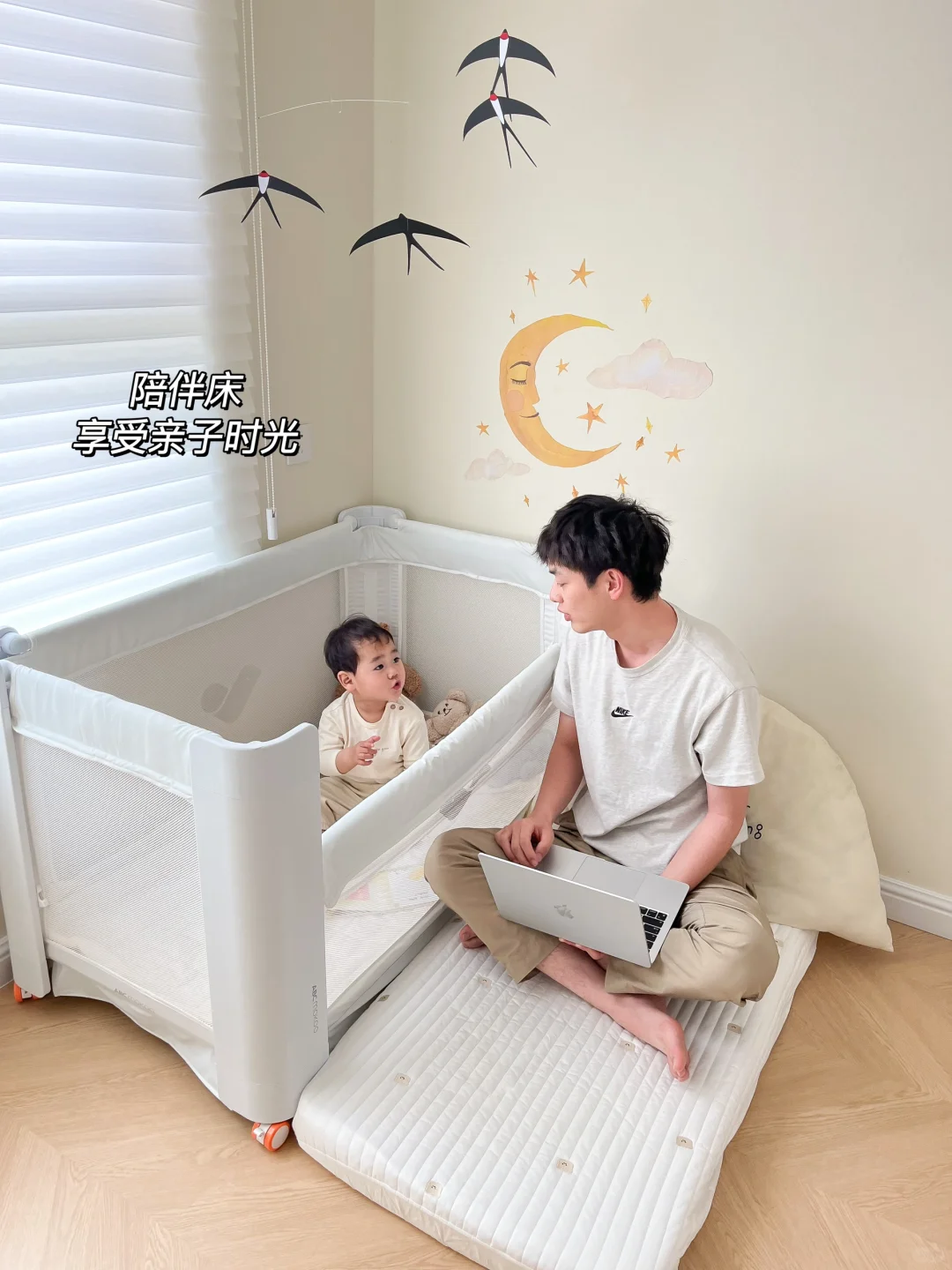 取下的床垫放在床的一侧,陪着宝宝,宝宝认真玩的时候自己还能追个剧,宝宝无聊了就陪他玩享受亲子时光
