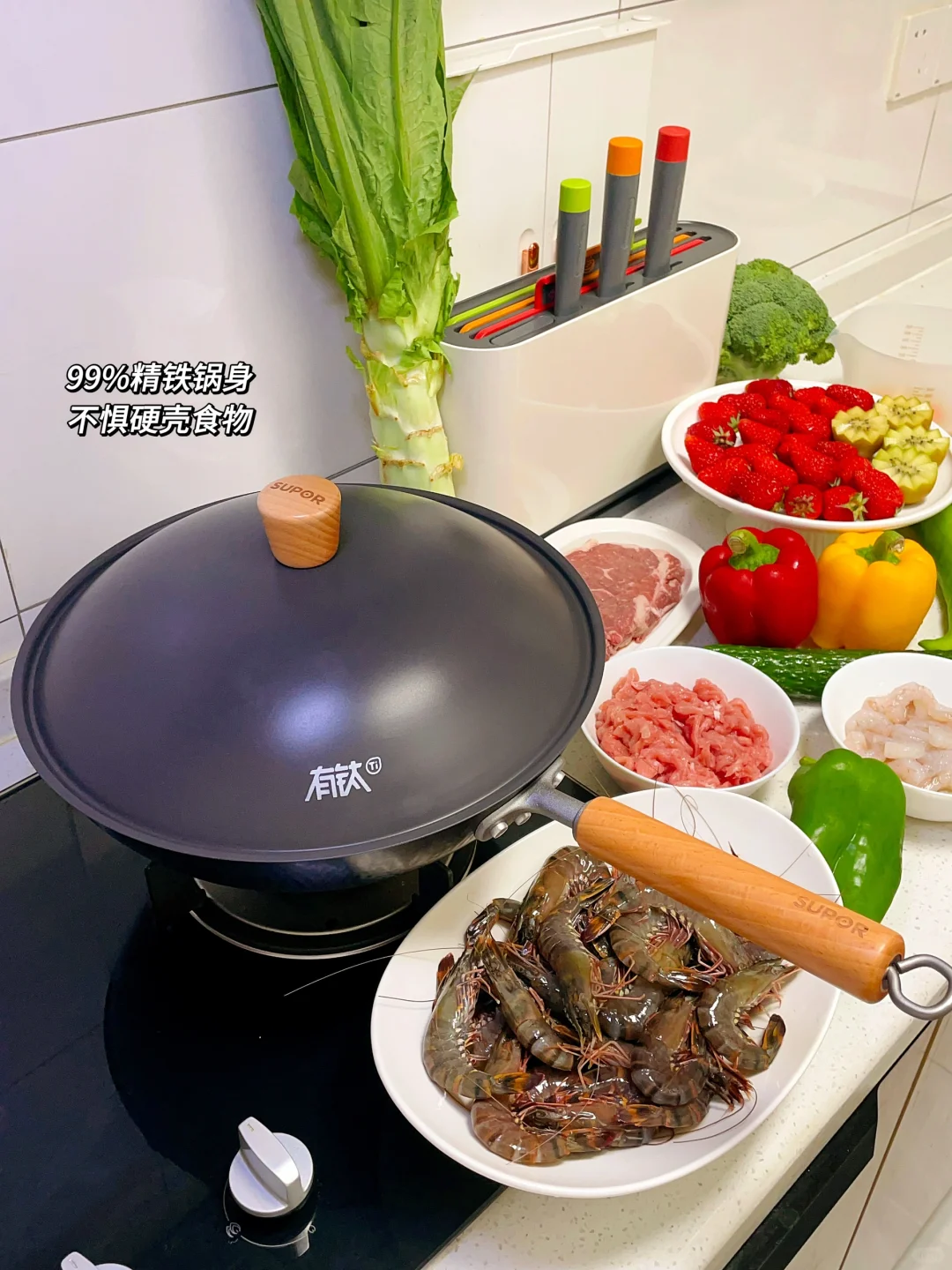 [集美R] 朋友每次来都喜欢看我做饭过程,他们觉得特有烟火气。其实做中餐锅气很重要,用铁锅炒菜不光有锅气、做出的菜也更香。但是很多宝子都用不好铁锅,觉得开锅、保养都比较麻烦,炒菜还粘得厉害。用不粘锅又担心有涂层不健康。最近我用的苏泊尔有钛铁不粘铁锅就完美的具备了铁锅和不粘锅的优点。