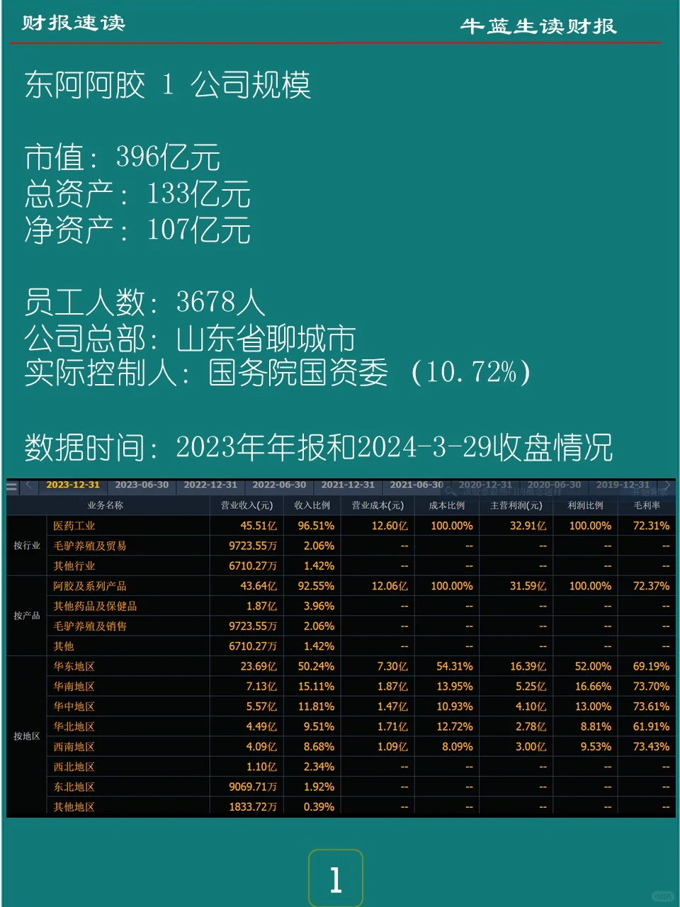 -按产品,阿胶及系列产品92.6%(44亿元),其他药品及保健品4.0%,毛驴养殖及销售2.1%,等。