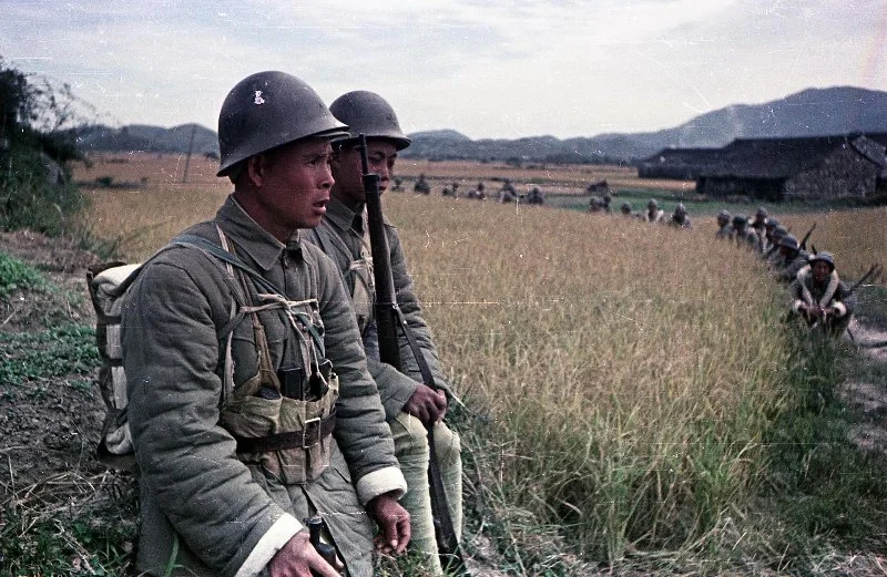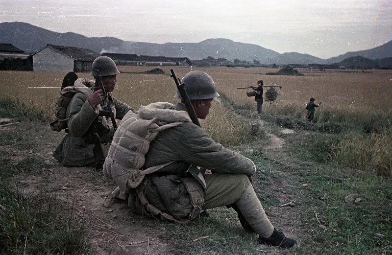 1949年,苏联摄影师镜头下在田间休息的解放军战士,可以看见他们普遍装备了缴获的日式90式钢盔。